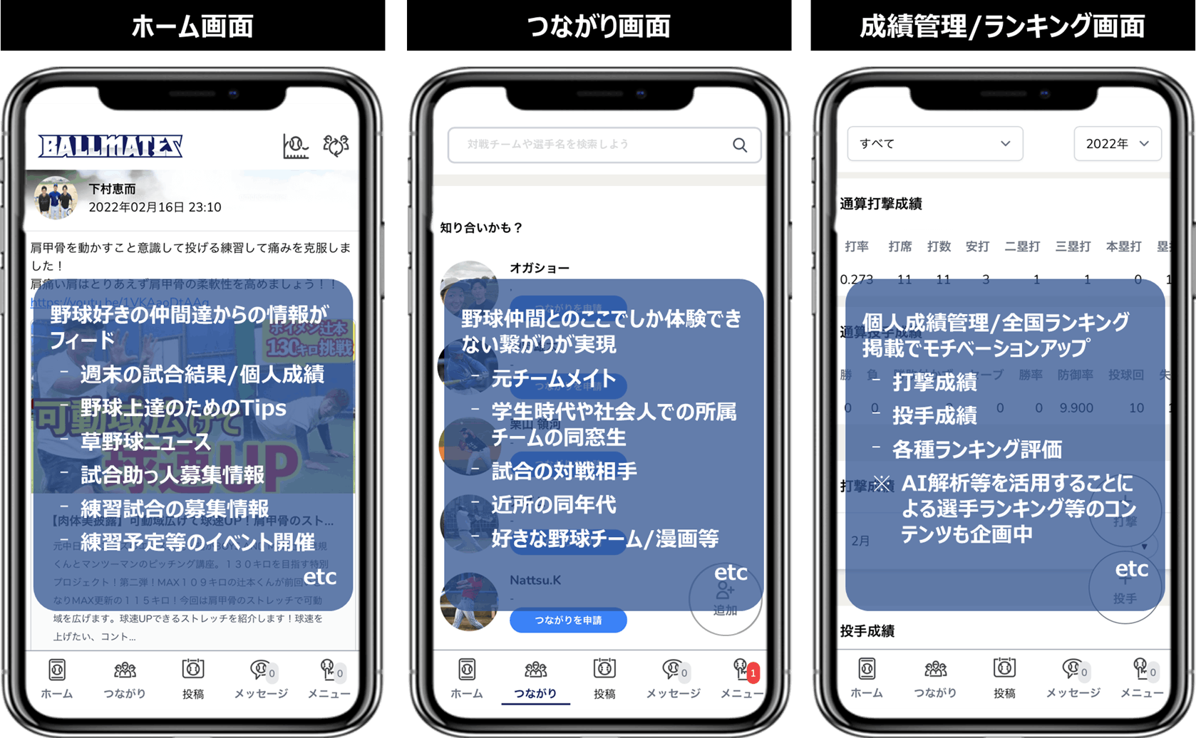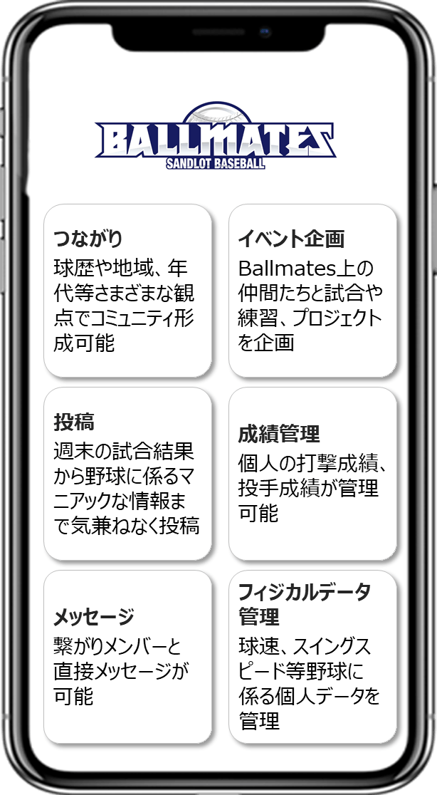 Ballmatesを使えば懐かしのメンバーや対戦相手たち、近場の野球選手、年齢の近い選手等と繋がることができ、試合結果や野球に関するトピックの情報共有が可能になります。