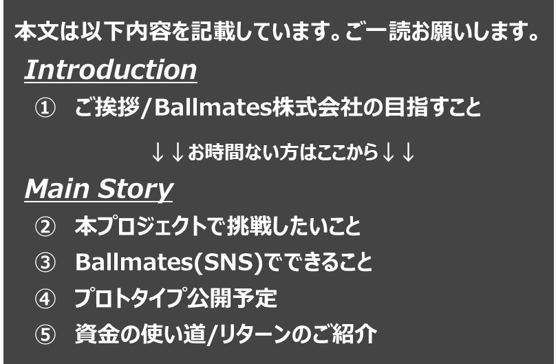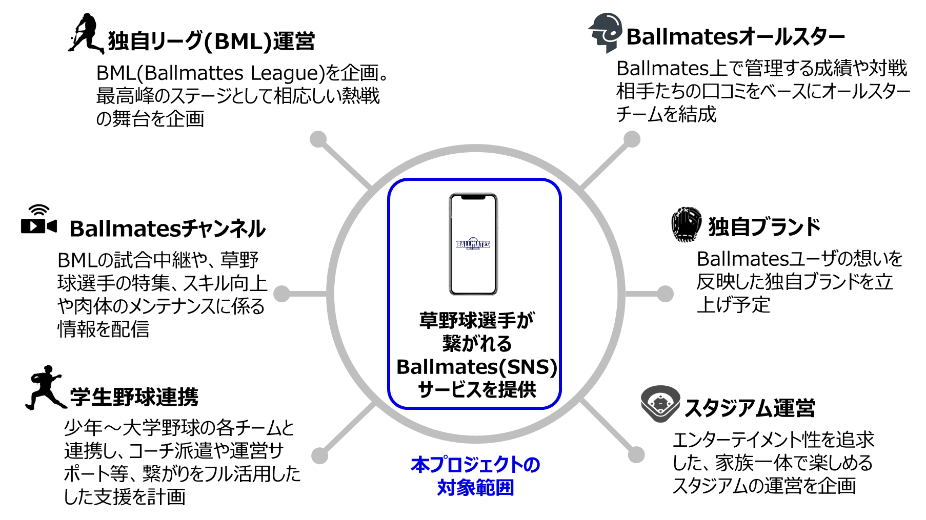 本プロジェクトでは、Ballmatesのコンテンツの充実とマーケティング強化を行うことで競技人口500万人超のユーザに浸透させ、会員数500万人規模の大規模SNSに発展させることに挑戦したいと考えています。