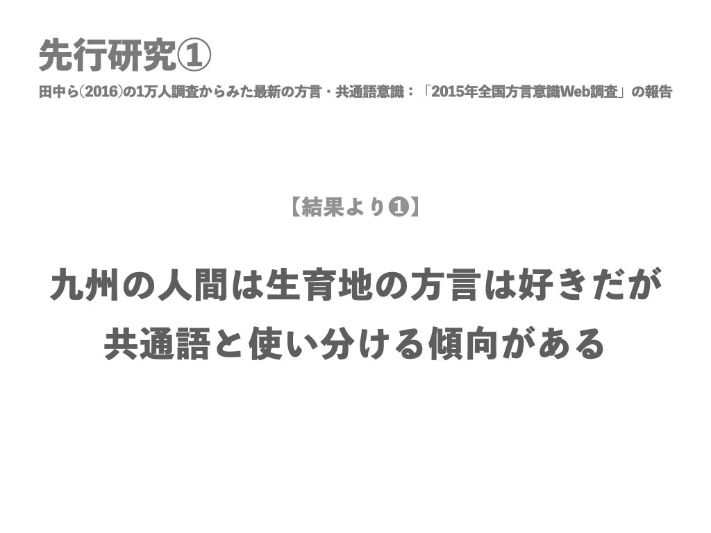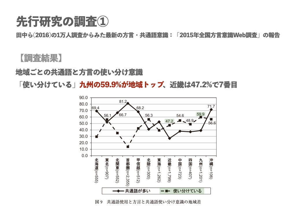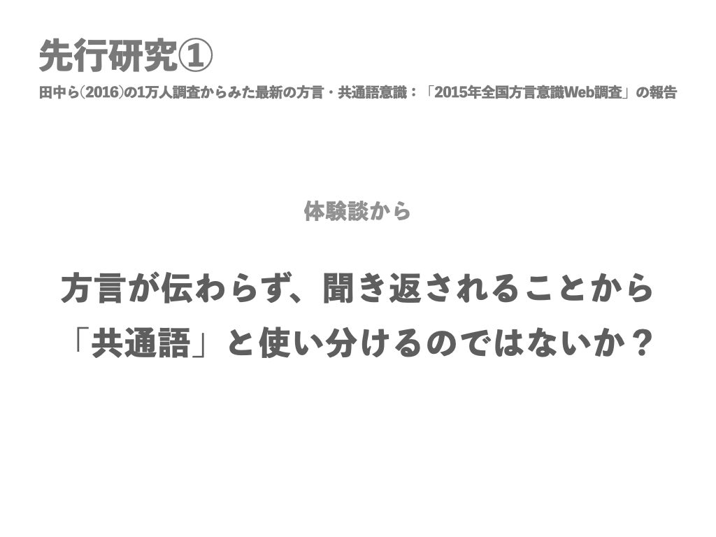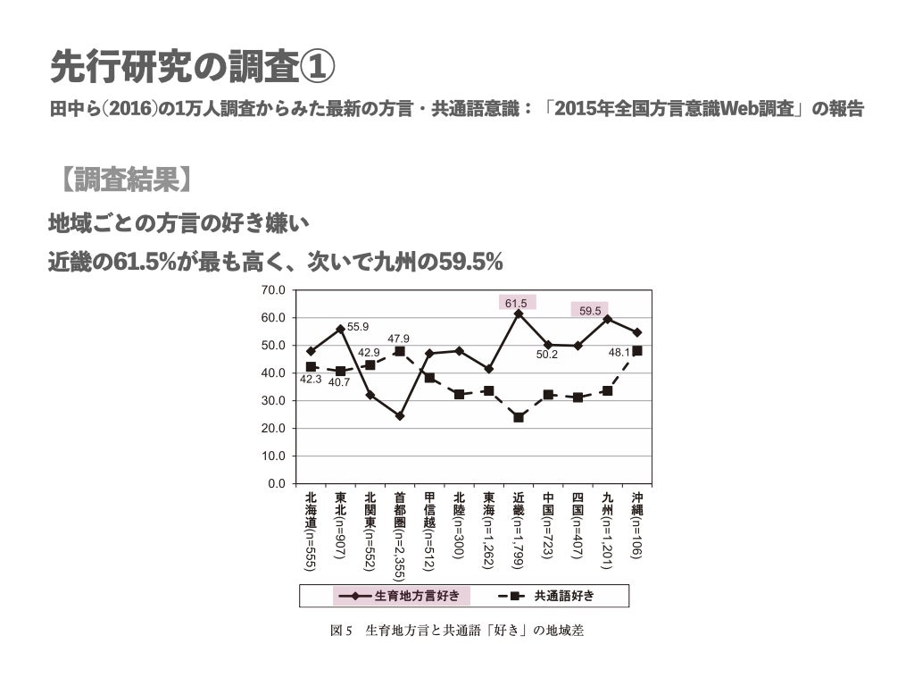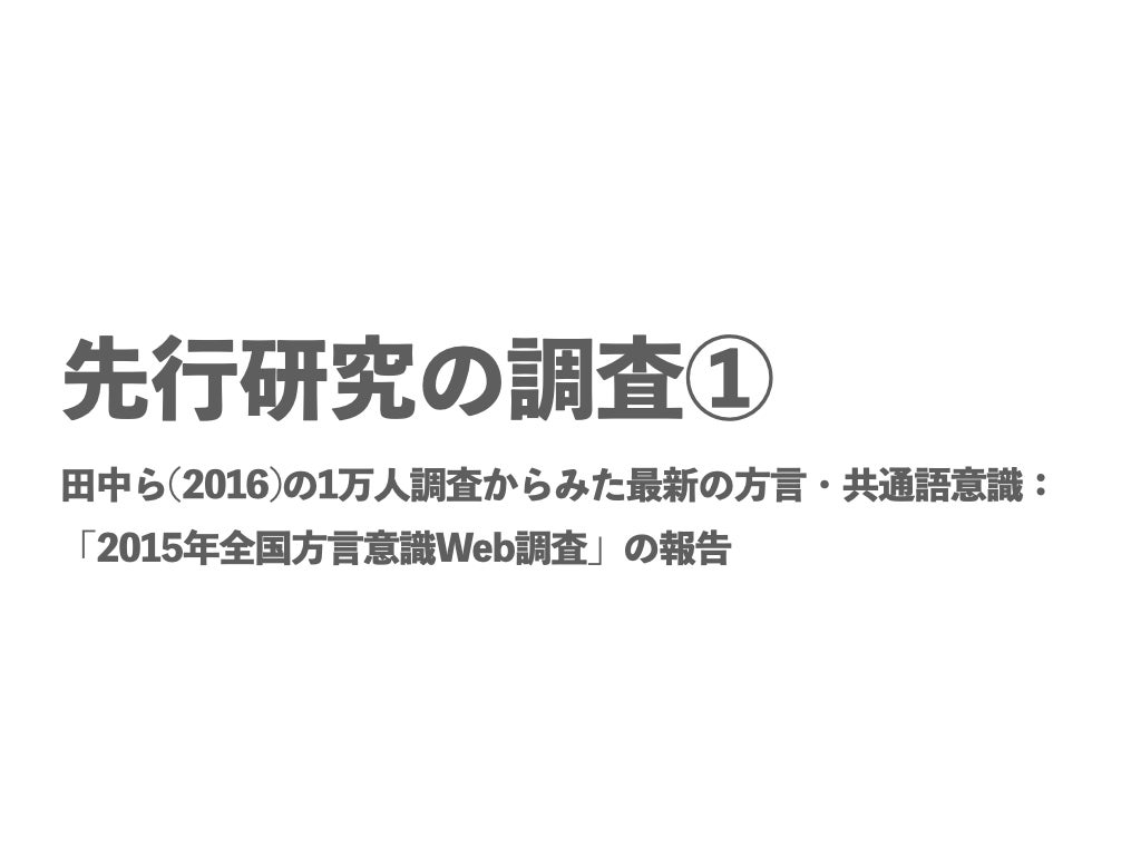 ①田中ゆかり・林直樹・前田忠彦・相澤正夫(2016).1 万人調査からみた最新の方言・共通語意識 :「2015 年全国方言意識Web調査」の報告,国立国語研究所論集, 国立国語研究所
