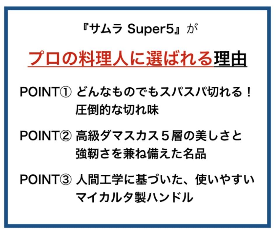 料理において、包丁がよく切れるかどうかはとても重要な問題です。『サムラ Super5』は、なんでもスパスパ切れる、気持ちの良い切れ味で多くの料理人から愛されています。