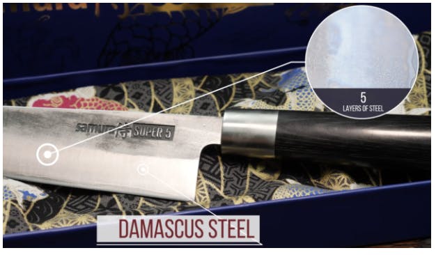 『サムラ Super5』は、「V金10号」という硬い芯材を、柔軟性のある「ダマスカス鋼」で挟む三層構造。