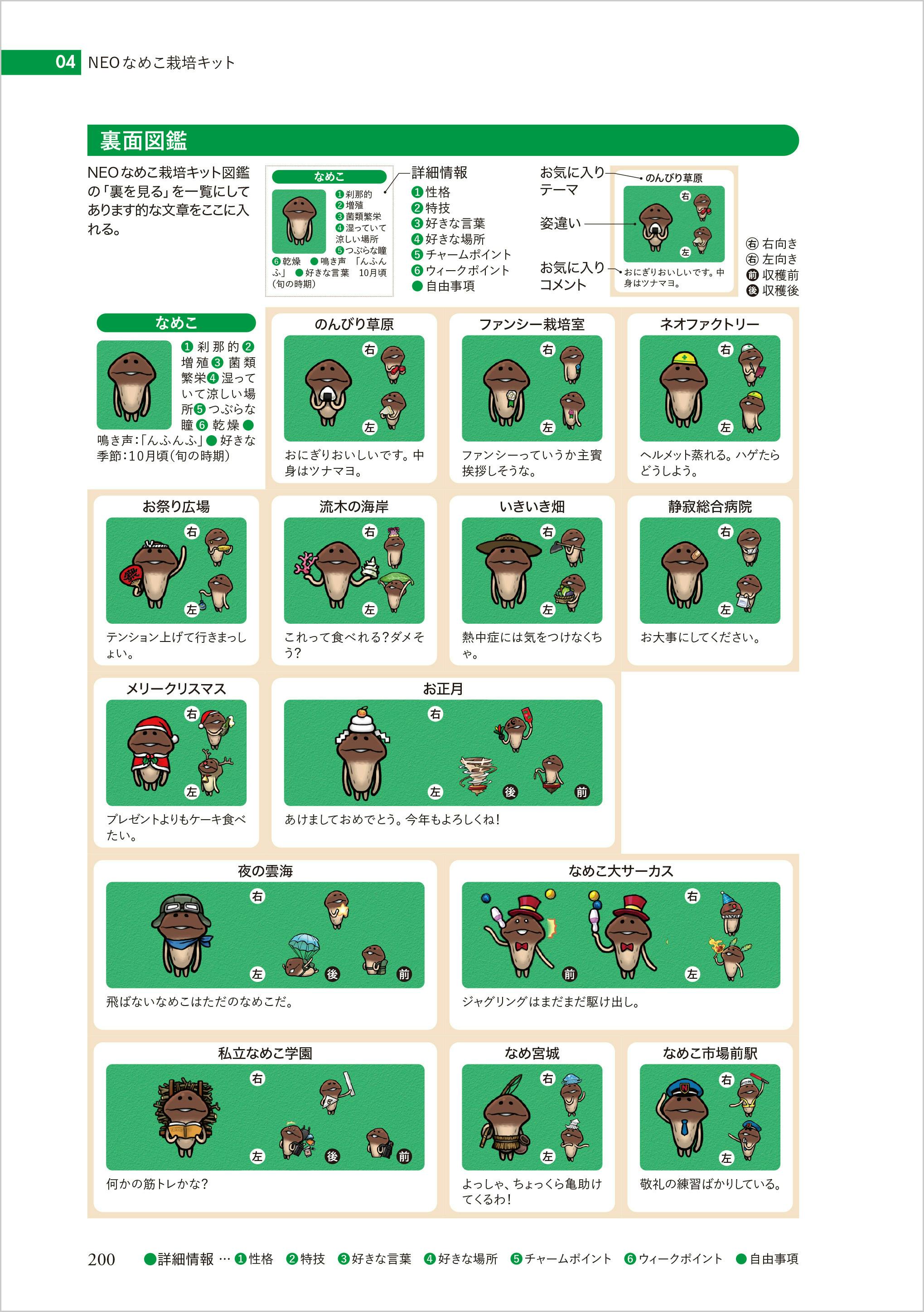 なめこのイラストともに、アプリごとに異なる図鑑説明文もあますことなく収録。