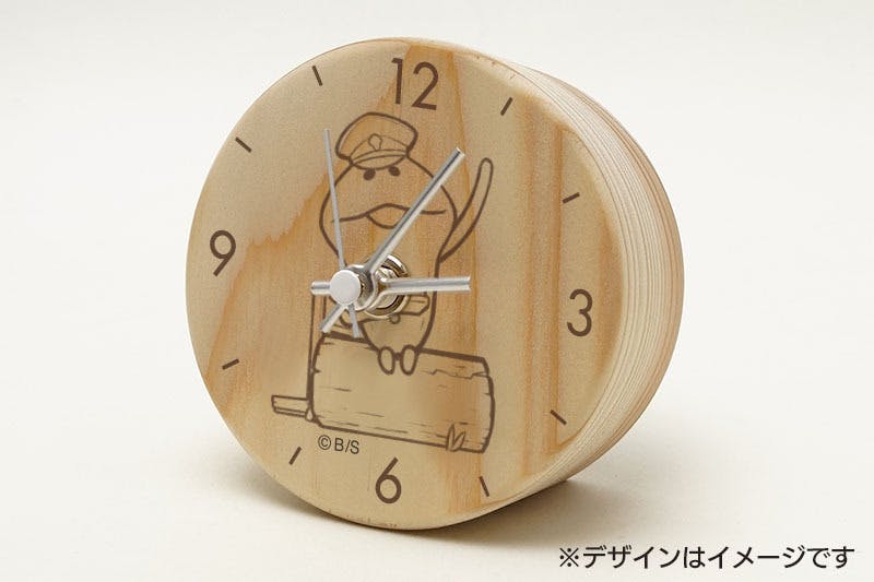 本プロジェクトのための描き下ろしイラスト「なめこ(菌次郎ver.)」が背負う原木をイメージした、木製置き時計です。