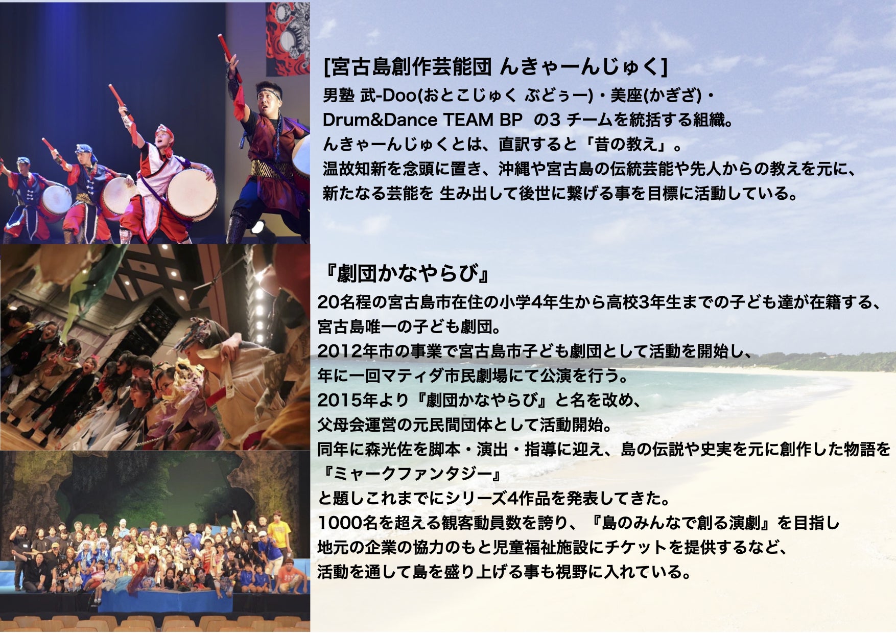 (※当プロジェクトには「宮古島創作芸能団んきゃーんじゅく」が共同運営で行なっております。「劇団かなやらび」は9月の公演に参加致します。)