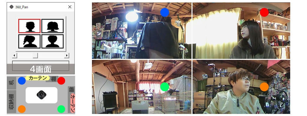 上段に360°全体、下段に2方向の映像をフォーカスして下に左右に拡大表示。