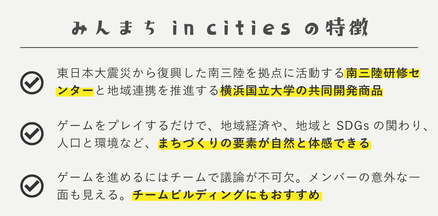 今回開発した「みんなのまちづくりゲーム in cities」は、2015年に一般社団法人南三陸研修センターが販売開始した「みんなのまちづくりゲーム」(以下:みんまち)を改編して開発された商品です。「みんまち」は、東日本大震災からの復興にあたって南三陸町が取り組んでいる森里海の循環型のまちづくりを、次世代を担う若者にわかりやすく伝えていくことを目的に作られたボードゲームです。2015年の発売以降、大学生や社会人、NPOなどを中心に300セット以上を販売。そして、1000名以上もの方にワークショップとして体験をしていただきました。