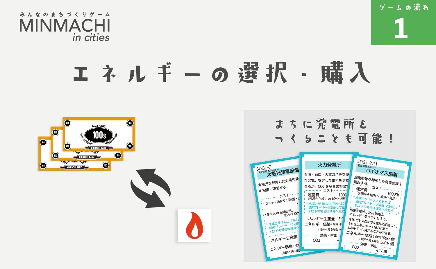 本ゲームでは住民のアクションを起こすにはエネルギーを必要とします。域外のエネルギー施設(火力・原子力・再生可能エネルギー)からエネルギーを購入したり、自分たちのまちにエネルギー施設をつくることもできます。