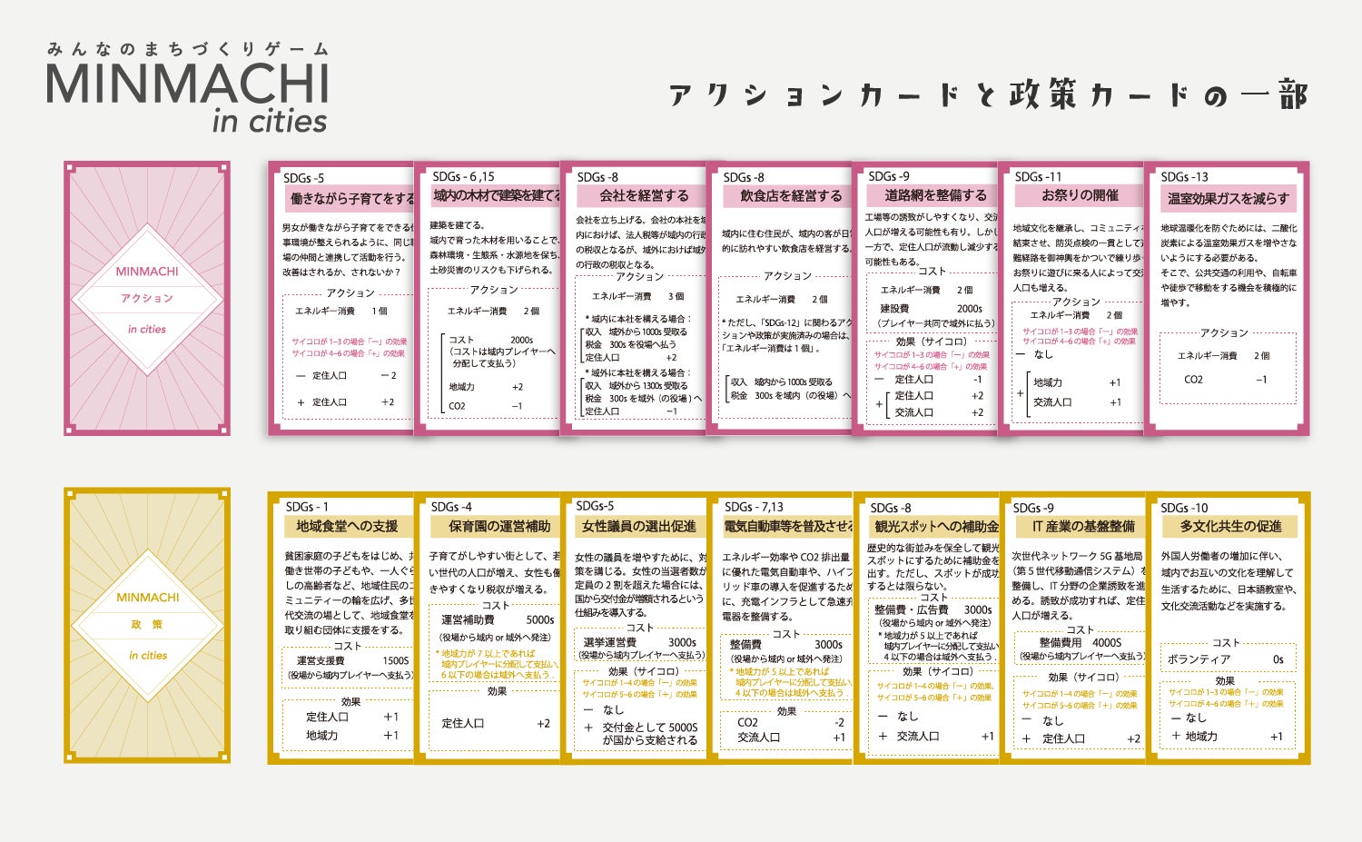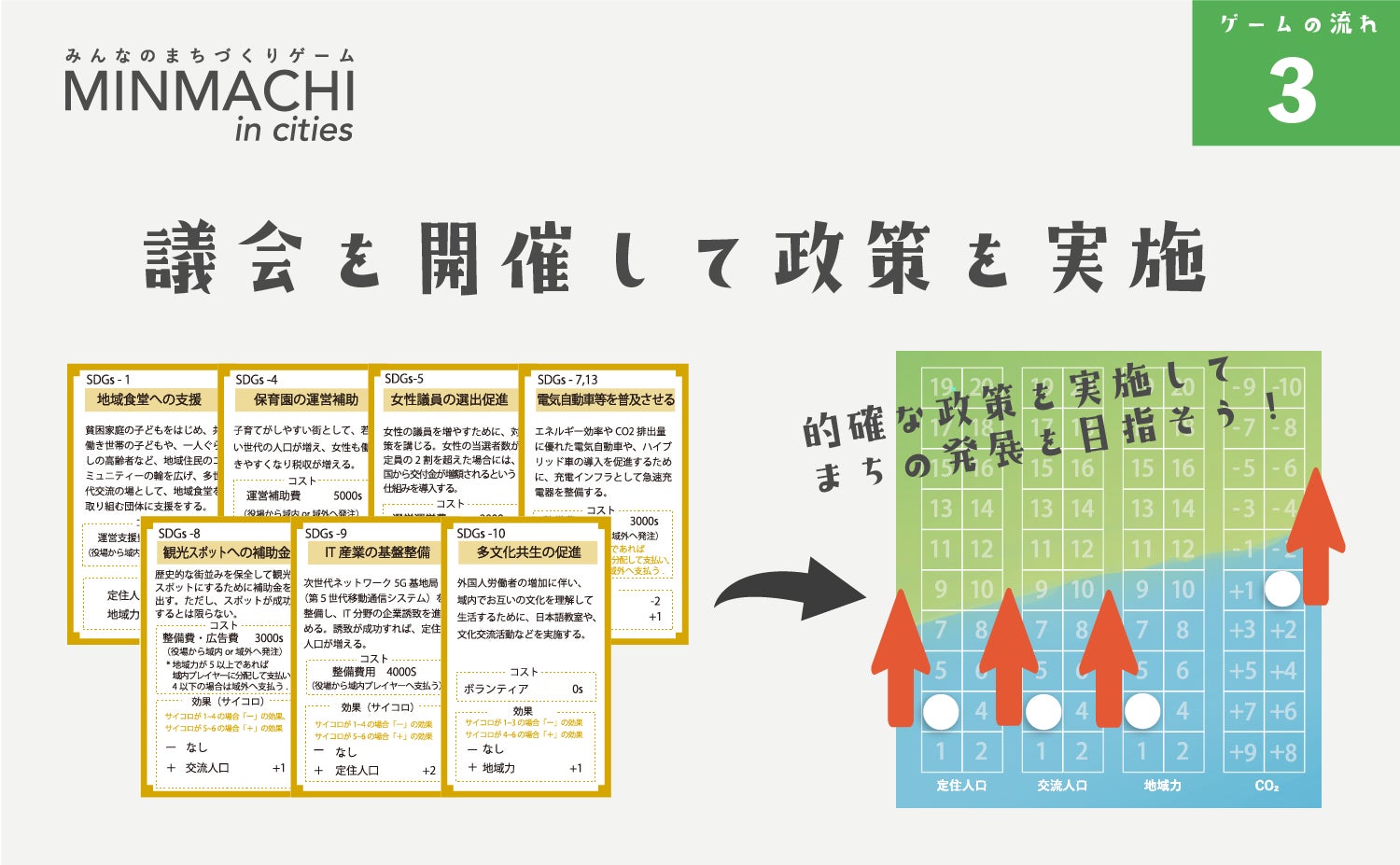 それがきっかけとなり、バージョン1の特徴を活かしながら、改編を行なっていくことになりました。専門的知識も交えて内容を高度化し、まちづくりにおける地域経済、地域行政を切り口として人・モノ・カネの流れ方を理解し、2030年に向けたSDGs の目標を盛りんだ「政策」および「アクション」をゲーム上の各カードに反映させることにしました。