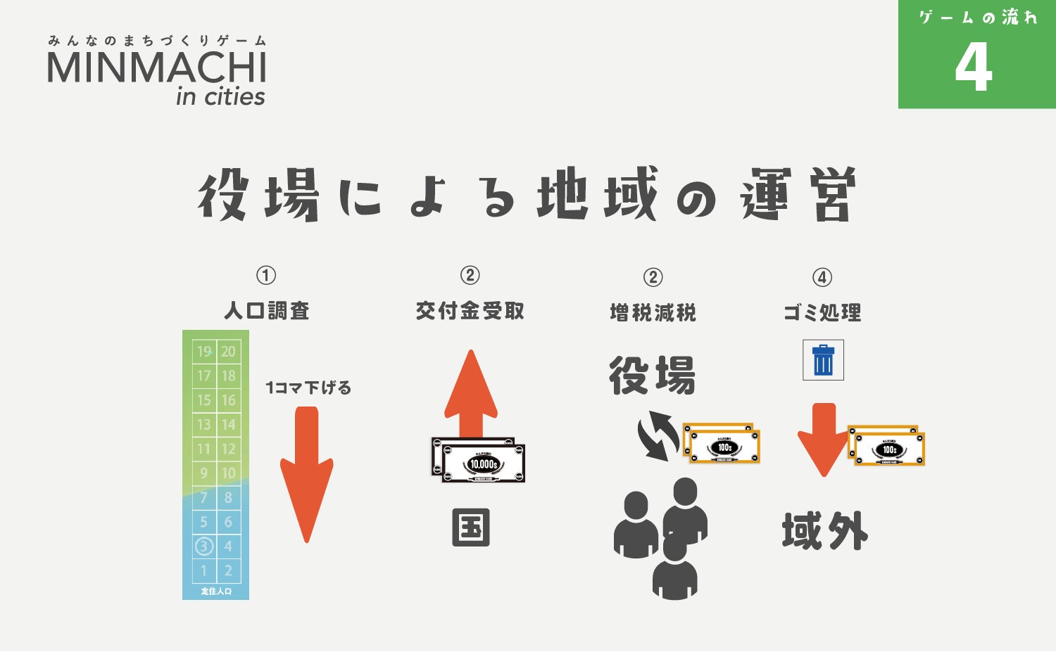 参加者はひとつのゲームにつき4〜6名が標準となります。このメンバーで一つの「まち」をつくっていきます。メンバーは役場1名と住民に分かれてまちを運営します。