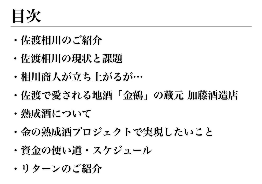オール佐渡産で醸す熟成酒と島内外から集まるオーナー様の力で、金山のまち相川に再び活気を取り戻す!そんなプロジェクトとなるようにリターンの内容を企画をしました。