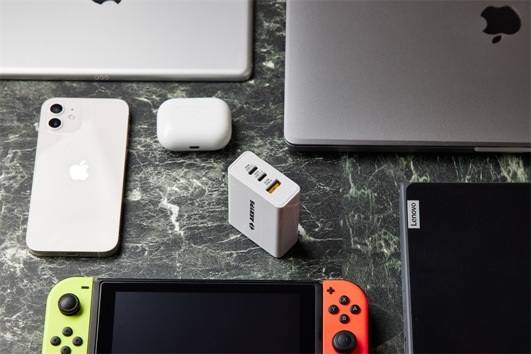 A : 従来の充電器に使用されていたSiよりも耐圧性と電力効率の高い「窒化ガリウム(GaN)」の採用で、発熱リスクをおさえ、安全性を確保しながら製品小型化を可能にしました。