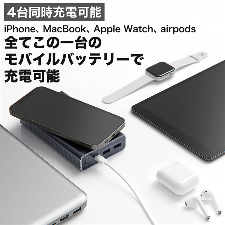 最大100Wの電力を供給できるUSB Type-C PD(Power Delivery)出力に対応した、パワフルなモバイルバッテリー。MacBookのような大型ノートPCやiPadなどタブレット端末も充電でき、外出先でPC作業をすることが多い方にオススメです!