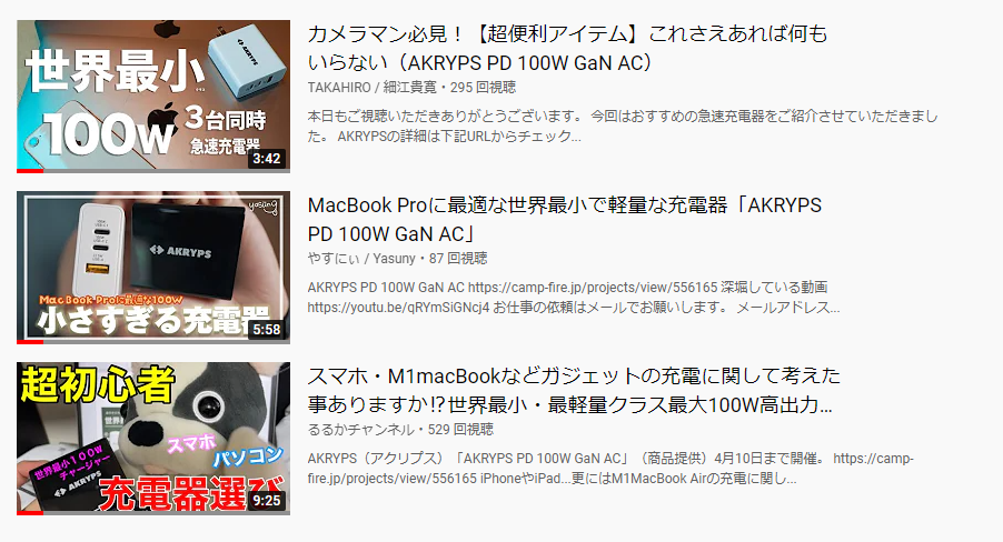 2022/04/06 19:00『AKRYPS PD 100W GaN AC』のプロジェクトにご支援をいただきありがとうございます!またまた、人気のYouTuberの方たちに『AKRYPS PD 100W GaN AC』をレビュー動画を投稿していただきました。実際に、ご使用いただいての使い心地や、どれだけ軽量でコンパクトか、従来の充電器と比べてどれだけ充電速度の速いかが、とても伝わる動画となっています。下記リンクからご視聴、またSNSでのシェアをしていただければ幸いです。 ▼【TAKAHIRO / 細江貴寛 】様(登録者数:7780人) https://youtu.be/G00zKHnrjPQ▼【やすにぃ / Yasuny 】様(登録者数:2.34万人) https://youtu.be/DTw9fbO5epI▼【るるかチャンネル 】様(登録者数:2.39万人) https://youtu.be/13VUsTAKUNY支援人数も340名様を突破しました!【残り4日!】1人でも多くの方に『AKRYPS PD 100W GaN AC』を知ってもらうため、引き続き、応援のほどよろしくお願いいたします! もっと見る