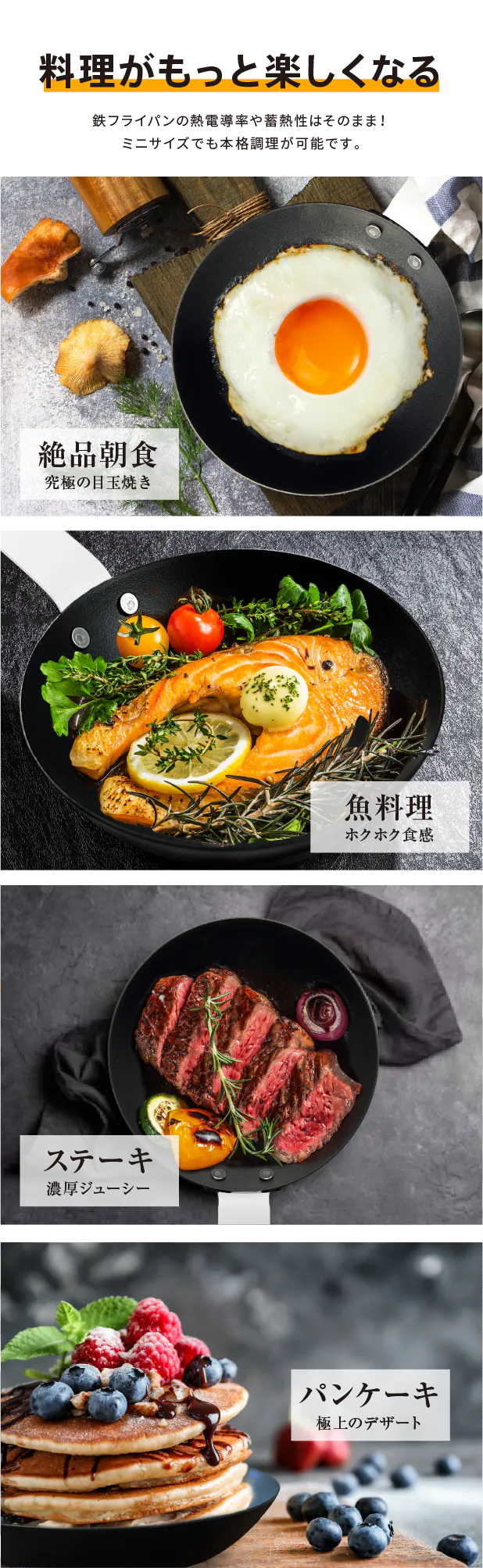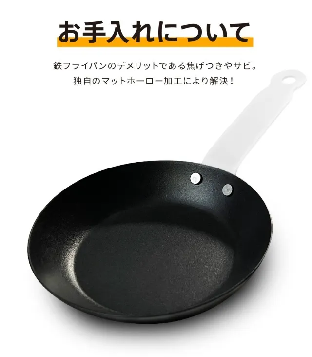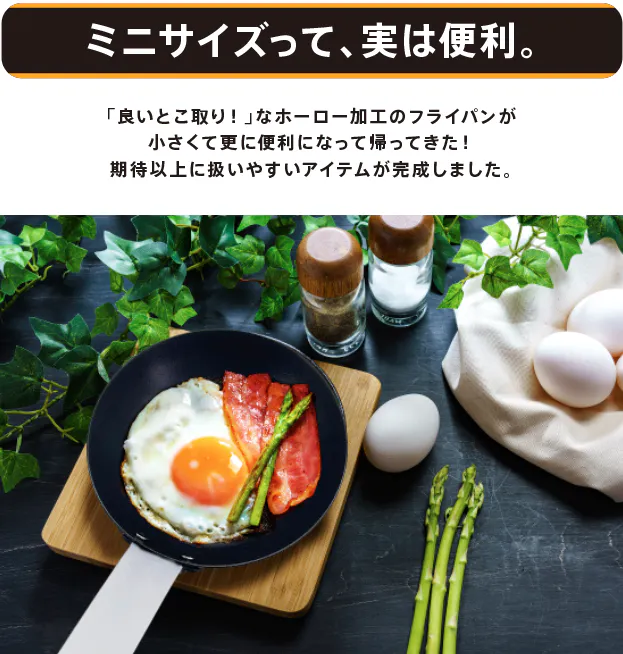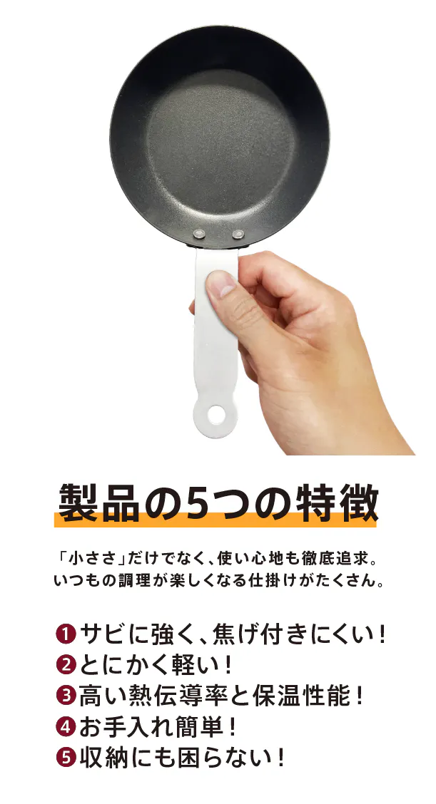 「忙しい朝に洗い物は減らしたい...」「洗い物がめんどくさい...」そんなあなたにピッタリなサイズ感。油に慣らした本体は「サッ」と一拭きで綺麗に洗浄。洗い物が苦にならりづらいのもミニフライパンの魅力の一つです。