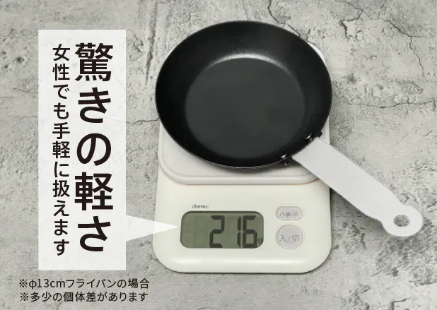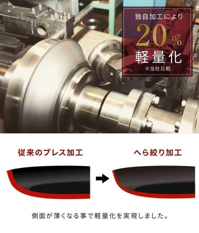 小さいから軽いのではなく、他社でほとんど使われていない「独自加工」により軽量化に成功。素材の特性はそのままに「鉄は重い」という弱点を極限まで解消しました。