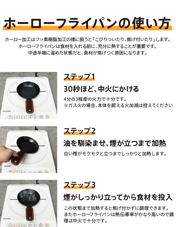 「ホーロー加工」とは金属の表面にガラス質の釉薬(うわぐすり)を塗り高温で焼き付ける加工のことです。これにより耐熱性、耐摩耗性、耐食性、保温性、臭い移りのしにくさなどがアップします。従来の弊社の鉄フライパンの『焦げ付きやすい』『サビに弱い』という弱点を克服しました!