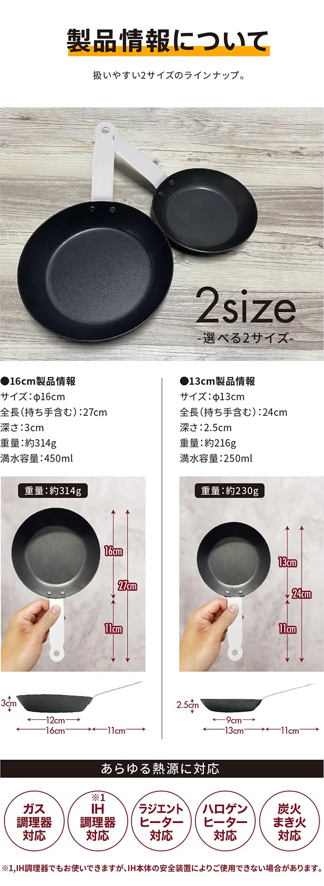 対応熱源:ガス火、IHコンロ(※1)、直火、ラジエントヒーターなど