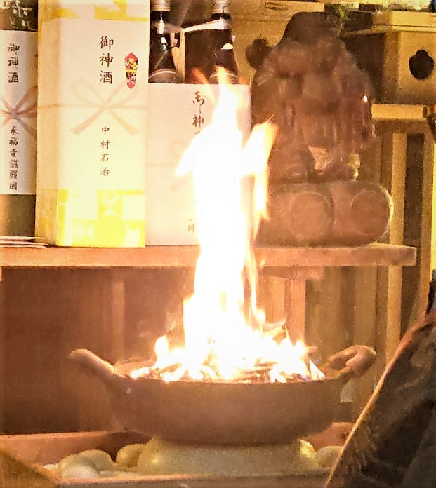 画像・七崎神社拝殿祭壇前:右側のご本尊仏像を少し左側から見てください、「炎と化し現れた御神体」と全く同じ形状をしています。詳しくは「炎と化し現れた御神体」をご参照ください。