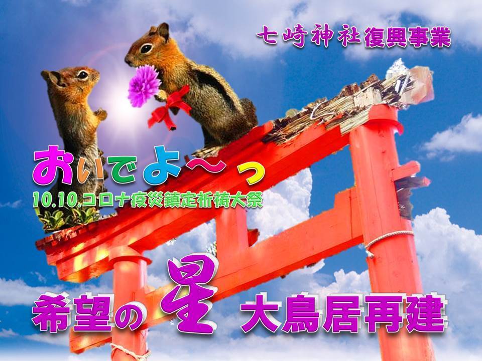 ※尚、 御支援頂いた全国の皆様に感謝を込めて、「本サイト」及び七崎神社 保存『永久の会』公式サイトを介して、「七崎神社コロナ疫災根絶(鎮定)全国祈祷大祭」 の模様や、「希望の星☆大鳥居」再建に挑む、宮大工”匠”たちの作業工程や完成画像など、公開させていただきます。