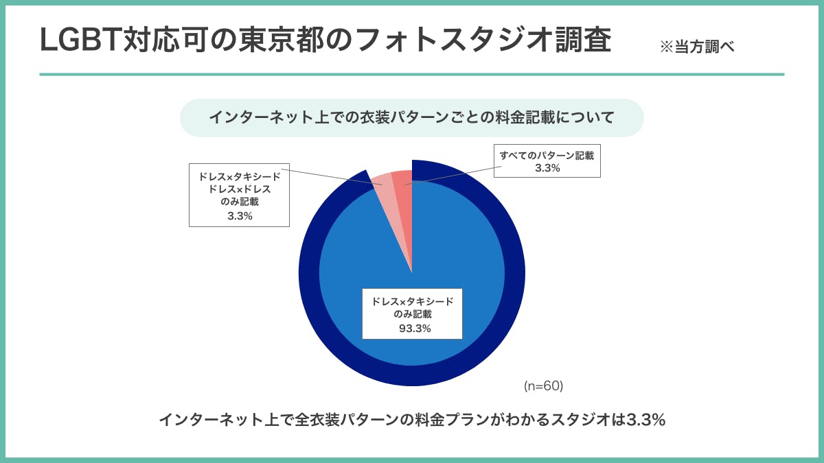 東京都のLGBT対応可と記載されていたフォトスタジオを調査した結果、93%(※1)のスタジオはインターネット上では「ドレス×ドレス」や「タキシード×タキシード」での料金がわかりません。