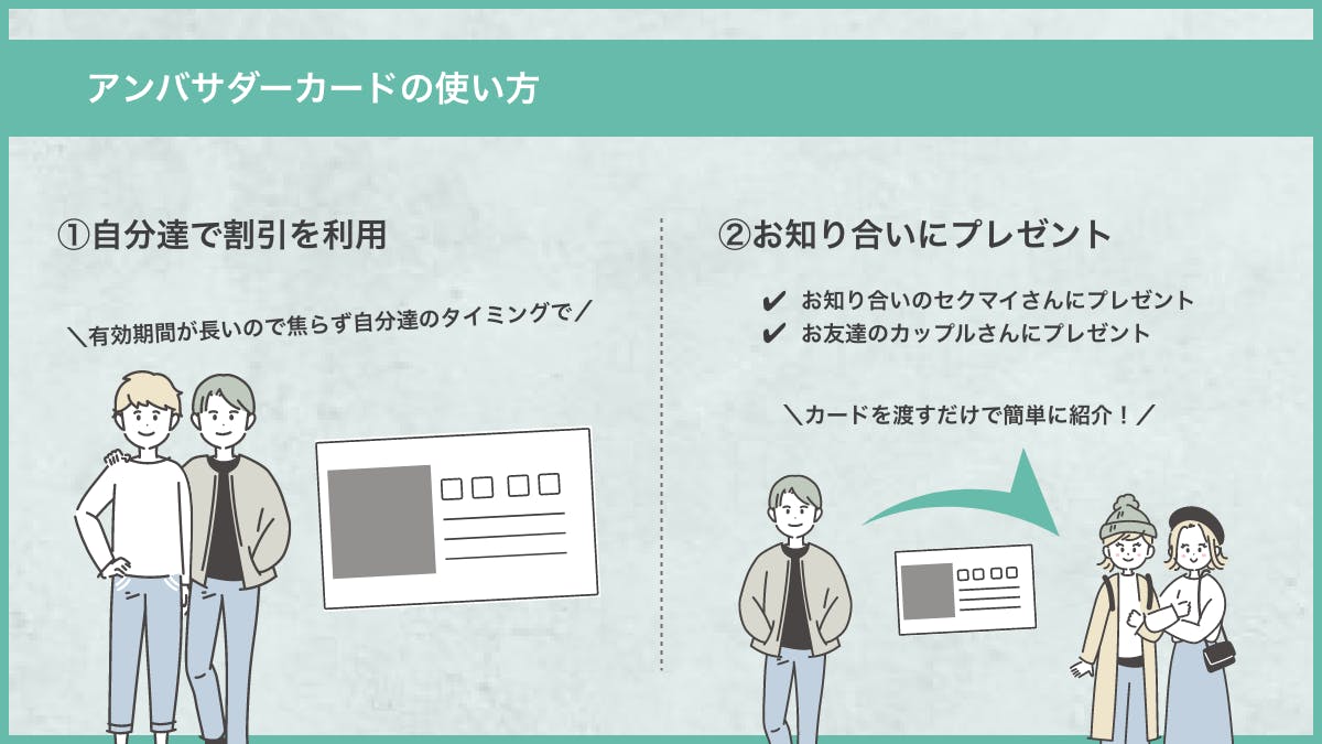 アンバサダー(支援者)カードはフォトウェディングやカップルフォトの割引クーポンとして利用できて、ご自身で利用いただくこともできますし、ご友人にお渡しすることもできます。