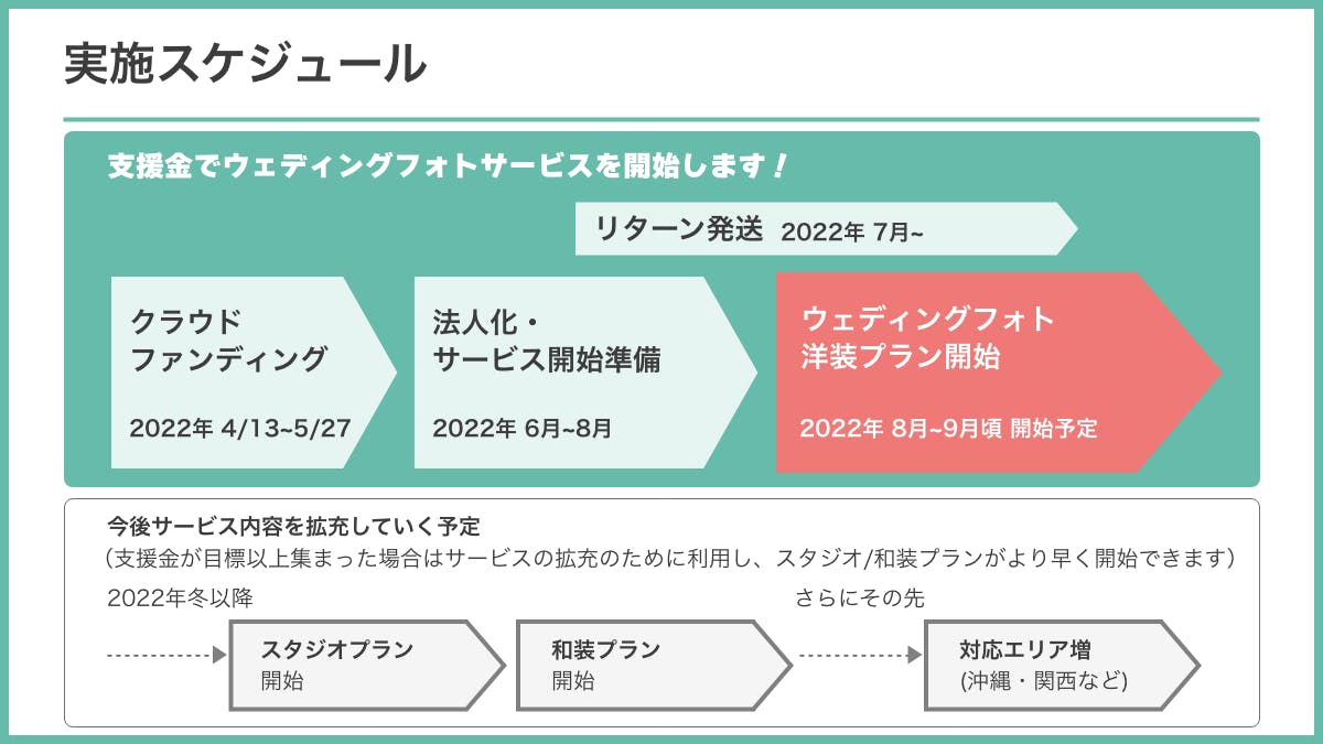 目標金額を上回った場合は、サロンの設備投資、撮影小物や衣装の充実、スタジオ撮影や和装などのプラン拡充に支援金を大切に使わせていただきます。