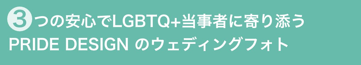 また、わたしたちはLGBTQ+当事者のフォトウェディングに対して、特別扱いが必要なのだとは考えておりません。LGBTQ+であろうが、そうでなかろうが、従来の新郎新婦ステレオタイプの押し付けを撤廃し、純粋におふたりに寄り添った結果がLGBTQ+当事者向けのフォトウェディングであると考えています。