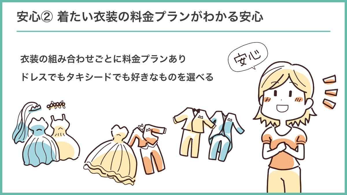 「PRIDE DESIGN」では、自分たちが着たい衣装を気兼ねなくお選びいただけるように、衣装の組み合わせごとにフォトウェディング撮影に必要な内容をセットプランでご用意。