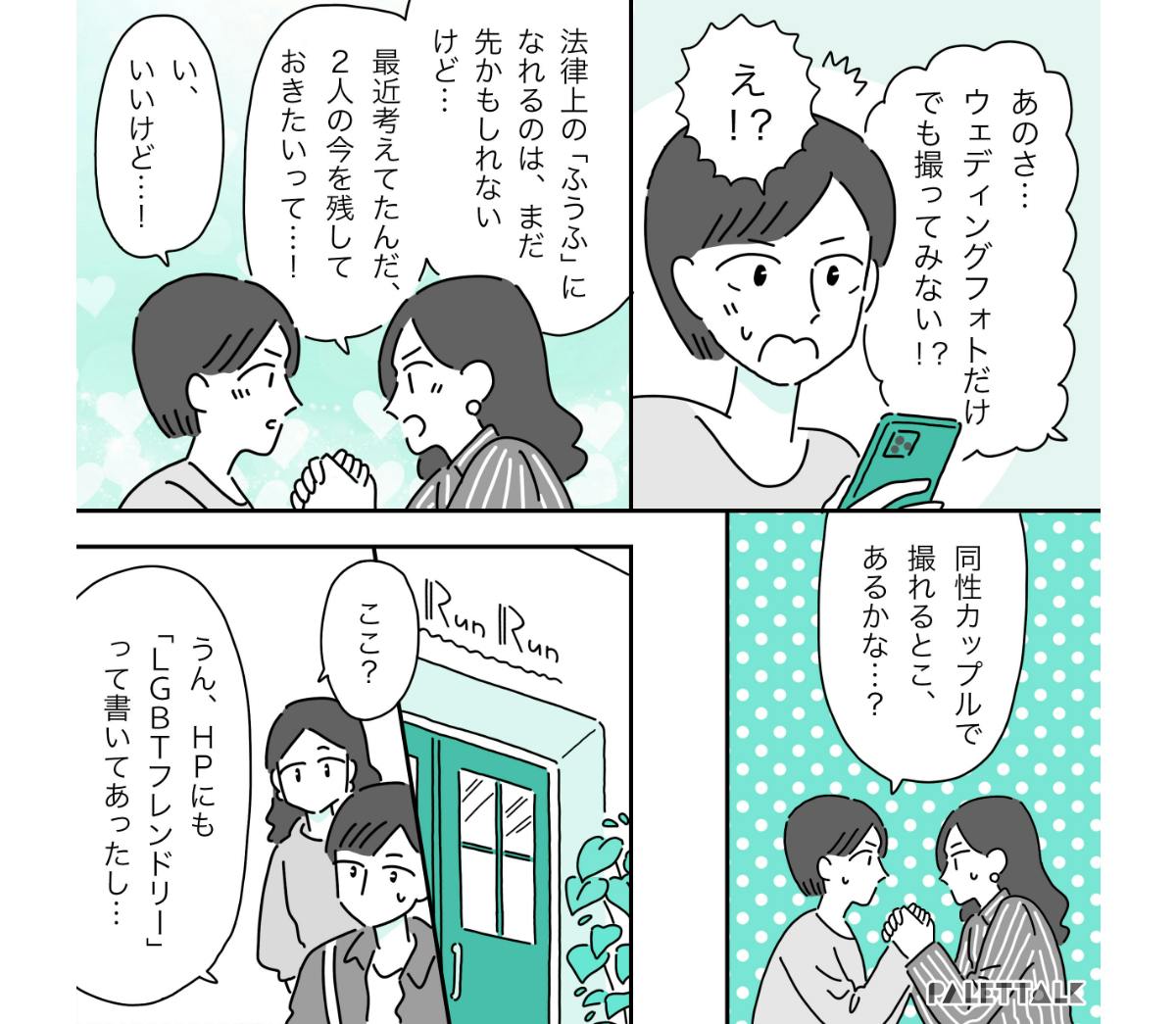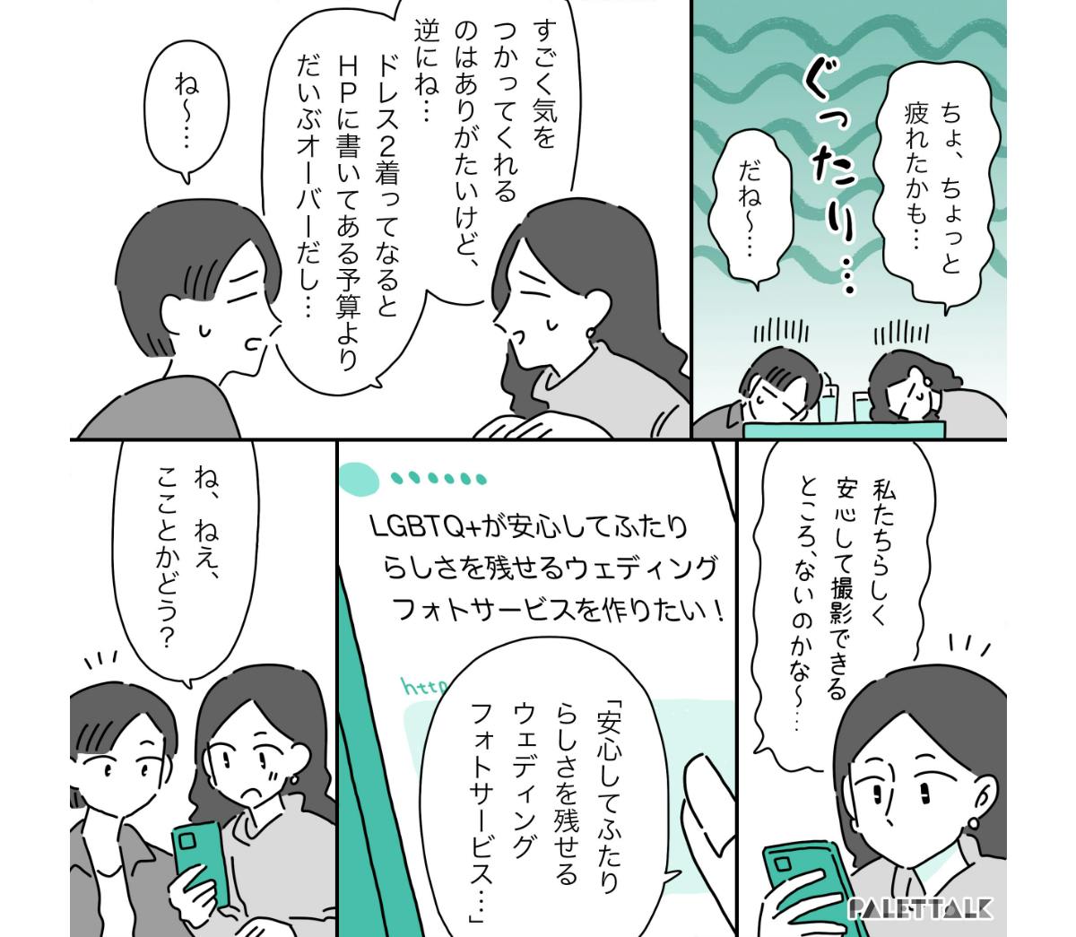 だからこそウェディングフォトだけは撮りたい気持ちはあるのですが、異性カップルばかりの写真がたくさん掲載されているwebサイトを見ると、胸が苦しくなってしまいます。