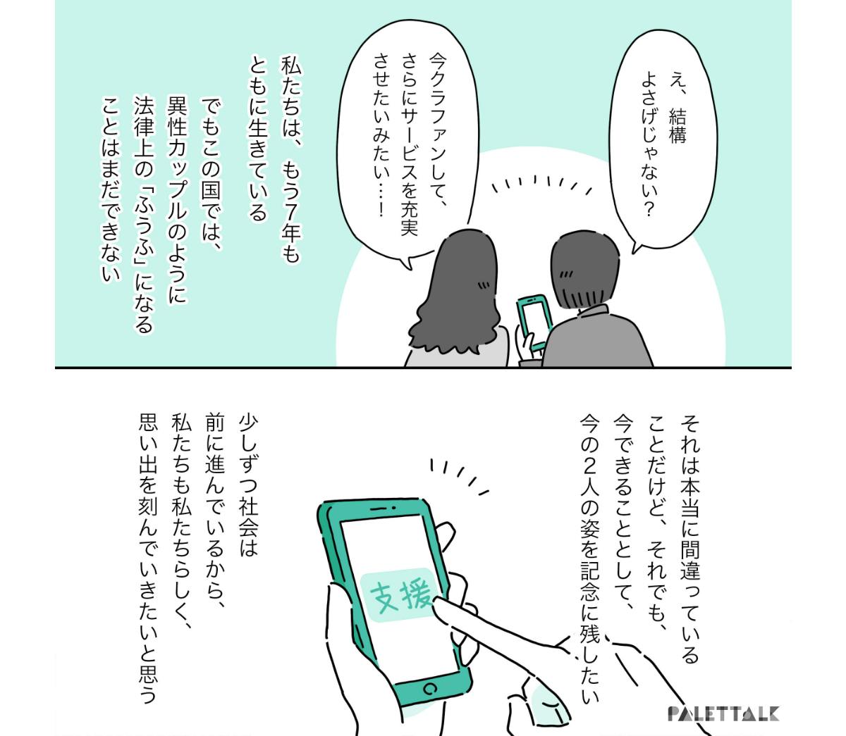 このサービスで「同性カップルのウェディング」が当たり前になったら、ボクのように苦い青春を味わう人もいなくなるのかな、なんて思っています。そんな未来の為に、これからも応援しています。