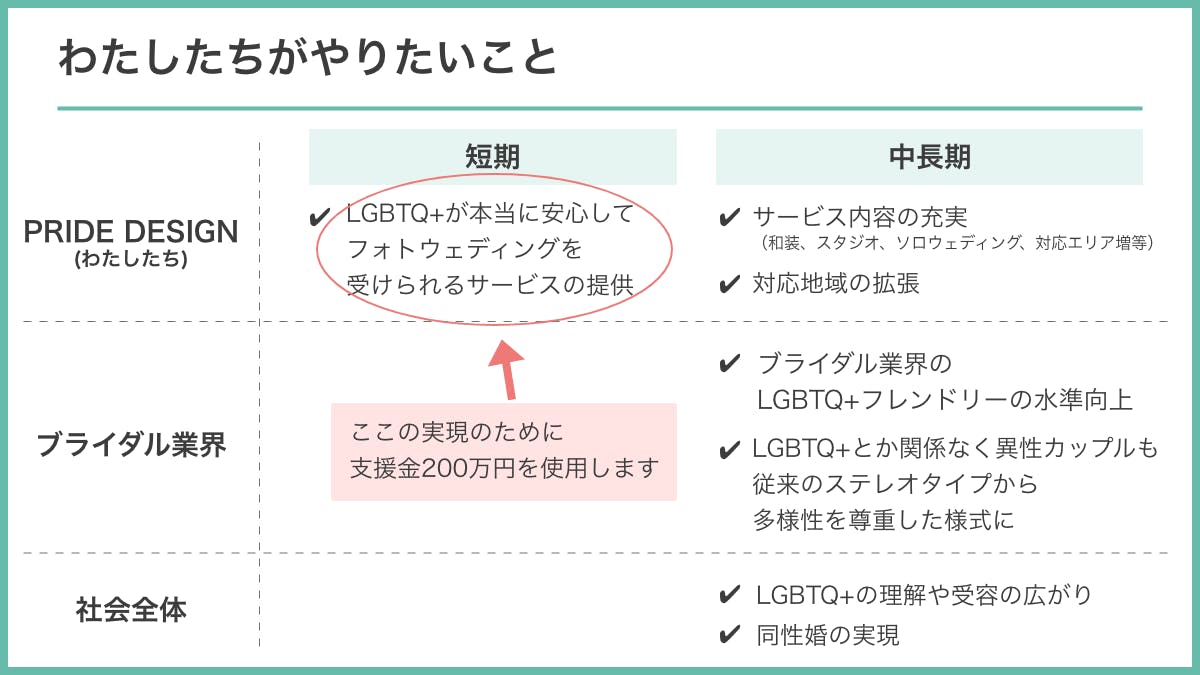 私たちが考えるLGBTQ+当事者のためのフォトウェディングサービスを立ち上げるため200万円という資金が必要です。