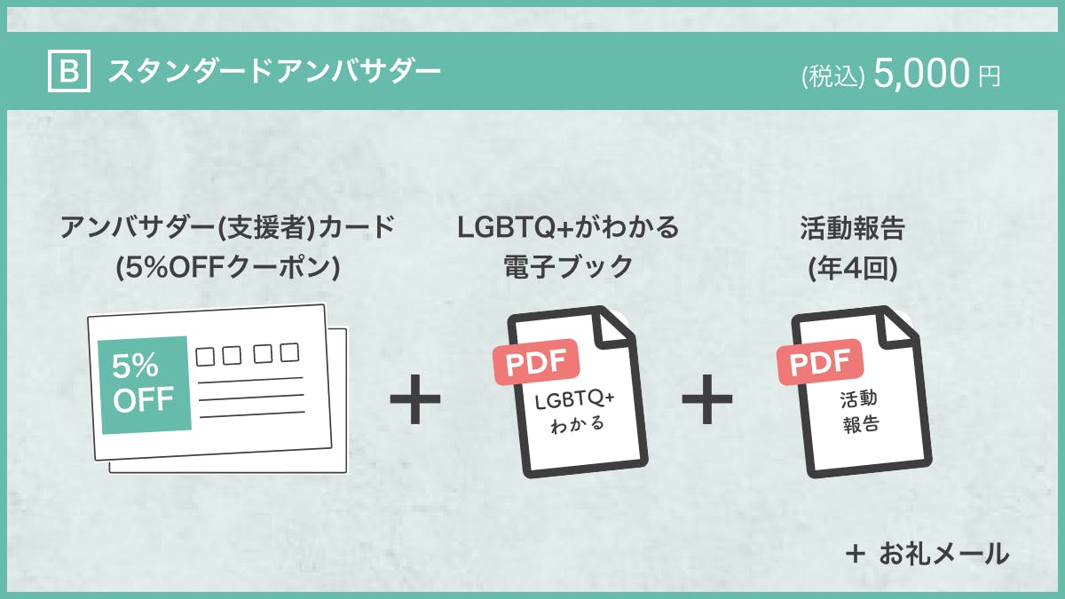 自分自身での利用でも、ご友人にプレゼントもできる、サービス利用がお得になるアンバサダー(支援者)カード、LGBTQ+の基本を改めて知りたいアライの方や、自分以外のセクシュアリティについておさらいしたい方、身近に人にLGBTQ+について知って欲しい方などに役立つ『LGBTQ+のことがわかる』電子ブック、サービス開始から一年間4回にわたっての活動報告などがセットの支援プランです。