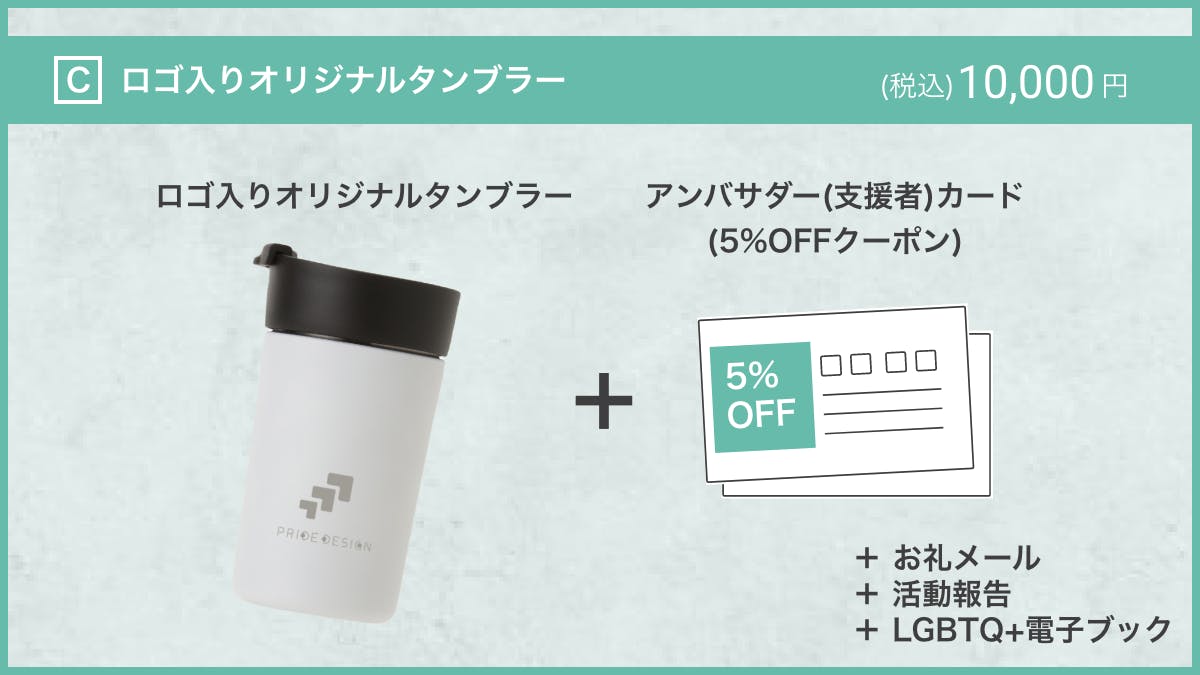 シンプルで普段使いしやすいロゴ入りオリジナルタンブラーとアンバサダー(支援者)カードなどがセットの支援プランです。オリジナルグッズを購入して応援したい方におすすめです。