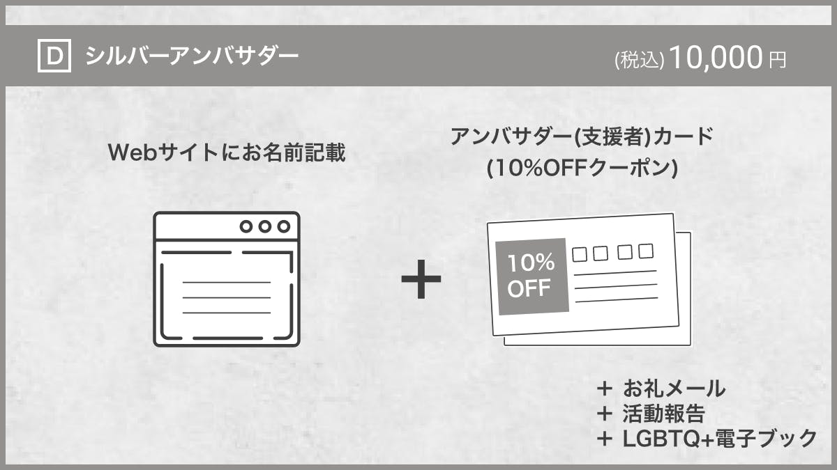 ご支援いただいた方のお名前Webサイトに記載と、10%OFFになるアンバサダー(支援者)カードなどがセットの支援プランです。ご支援した証を記念に残したい方や、よりお得になるクーポンが欲しい方はおすすめです。