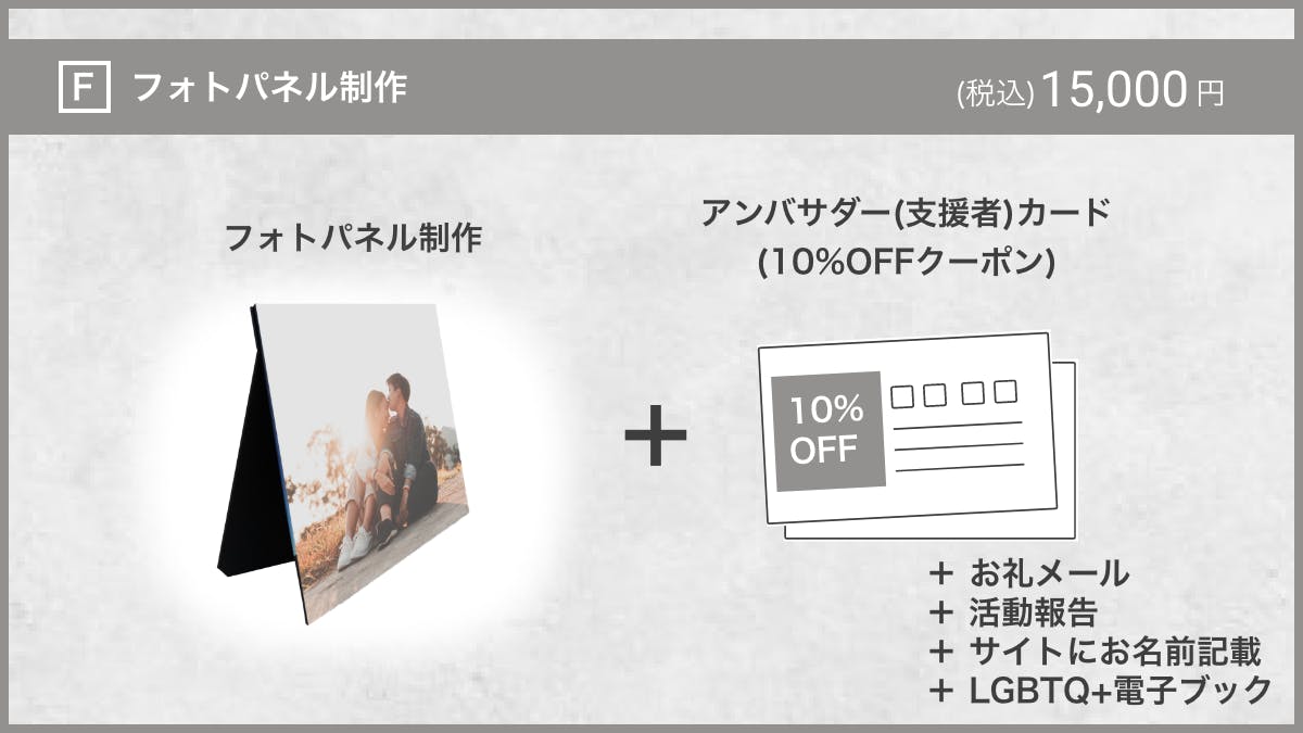 パートナーとの思い出の写真、家族写真、ペットのお写真など、お好きなお持ちの写真データからフォトパネルを制作します。10%OFFになるアンバサダー(支援者)カードなどもセットの支援プランです。想い出をカタチに残しながら応援したい方におすすめです。