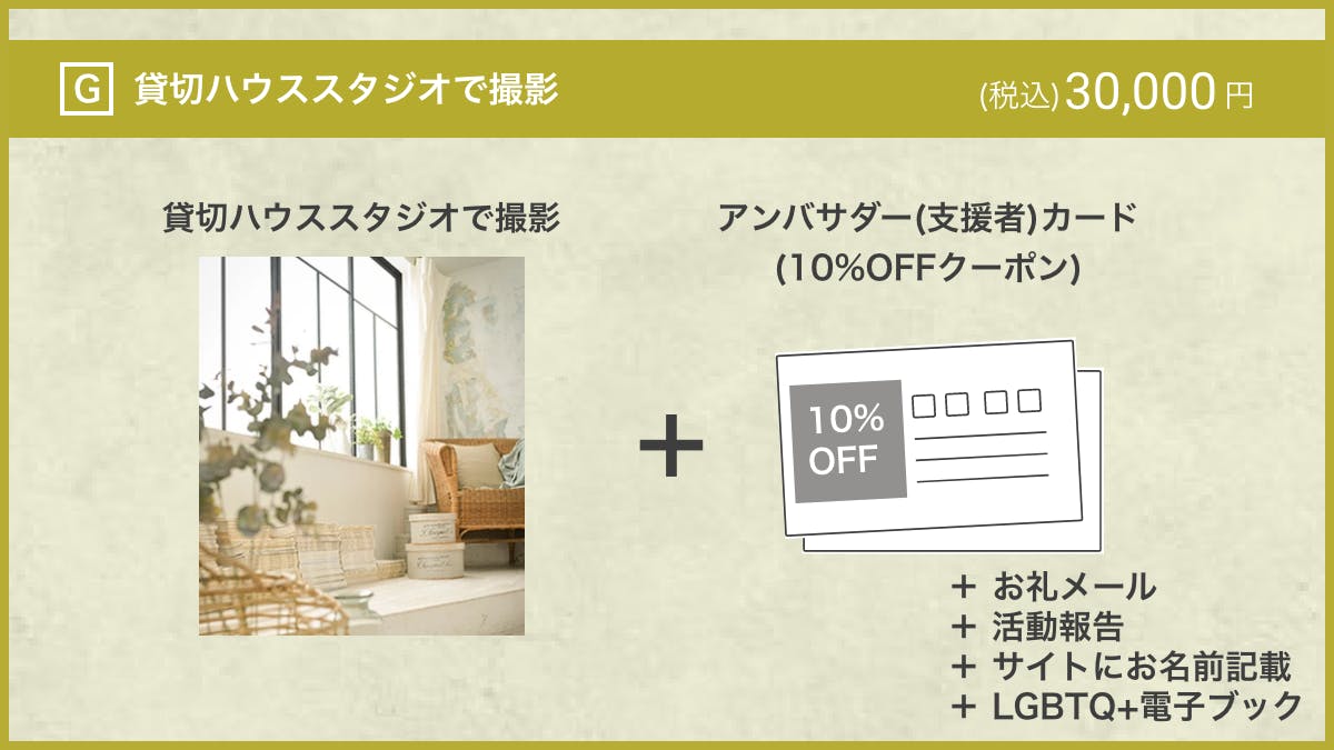 ハウススタジオを貸し切りプライバシーが保たれたリラックスした状態で、おひとりでも、ご家族やご友人とでも撮影ができます。10%OFFになるアンバサダー(支援者)カードなどもセットの支援プランです。日常ではあまりないプロのカメラマンによる撮影で記念を残したい方やプロフィール写真を撮影したい方におすすめです。