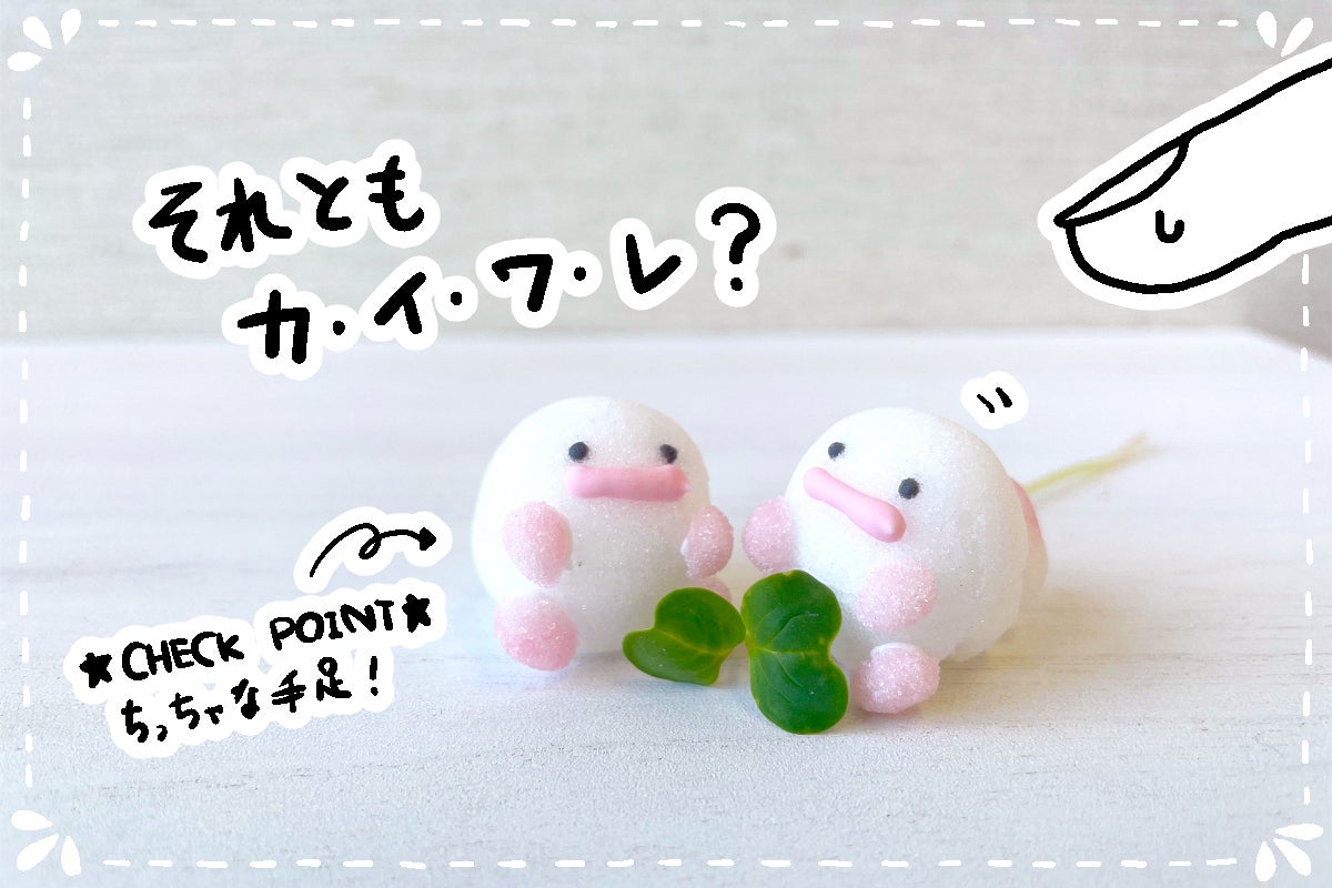 コロンと丸い体に、優しいピンク色の小さな手足、ぷっくりした尻尾…いろんな角度から観賞できます。さらにボーロや金平糖など、小さなお菓子と並べていただくとオオサンショウウオのご機嫌な様子が再現可能!