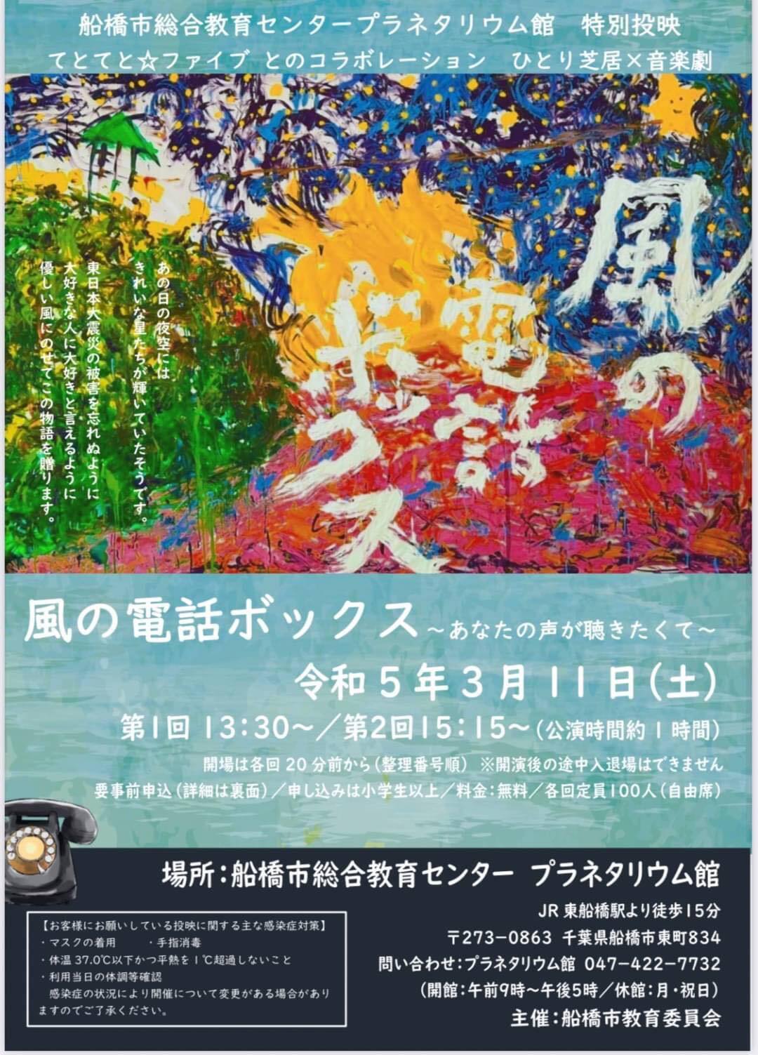 2023/02/08 23:10みなさん、お元気ですか?あっという間に2月になり、去年のことを思い出します。去年の今頃はクラウドファンディングを始めて、右も左もわからず不安の日々。それでも毎日、毎日ファミリーが増えていき、多くのファミリーの方々から励ましの言葉をいただき、その言葉を力に、走り続けていました。今思い返しても、皆さんのお言葉やお気持ちに涙が出そうになります。そんな応援してくださるファミリーの皆様に、今日はお知らせがあります。クラウドファンディング後に重ねたファミリーミーティングでも何度もお話ししていました、私たちの夢。「風の電話ボックス~あなたの声が聴きたくて」プラネタリウム公演。なんと、なんと、開催が決定しました。しかもしかも!!!2023年の3月11日(土)!!千葉県の船橋市にあるプラネタリウム館にて。皆さんの応援のおかげで、ついに実現となります。本当にありがとうございます。詳細は以下となります。船橋市総合教育センター プラネタリウム館特別投影てとてとファイブとのコラボレーション ひとり芝居×音楽劇「風の電話ボックス~あなたの声が聴きたくて」日時:2023年3月11日(土)①13:30~/②15:15~(公演時間1時間)(開場30分前)※お申込みは小学生以上/料金は無料/定員は各回100名申込:①ハガキで申込/②Webの応募フォームでの申し込み。①はがきの場合〔希望する公演(第一回・第二回・どちらでも可のいずれか)/郵便番号/ご住所/代表者氏名(ふりがな)/参加人数(1組5名以内)/(お子様が参加の場合)お子様の参加人数・年齢/電話番号をハガキに明記してご応募ください。②Webフォームで応募する場合は以下のURLよりhttps://www.city.funabashi.Ig.jp/shisetsu/bunka/0002/0002/0001/p011085.htmlお申込みください。※当選者のみ、当選ハガキを開催日の10日前までに返信します。※定員に達しない場合は 3/1(水)~3/8(水)までの期間で追加申し込みを受け付け場所:船橋市総合教育センター プラネタリウム館千葉県船橋市東町834 お問い合わせ:プラネタリウム館 047-422-7732※当日は会場で行います感染症対策へのご協力をお願いいたします。3月11日当日に公演させていただけることに、改めて感謝の思いと共に、身の引き締まる思いです。皆さんとお会いできる日を楽しみにしながら、最高の作品にすべく稽古に取り組みます!ファミリーのみなさんとお会いできたら、こんなにうれしいことはありません。ぜひ、いらしてくださいね! もっと見る
