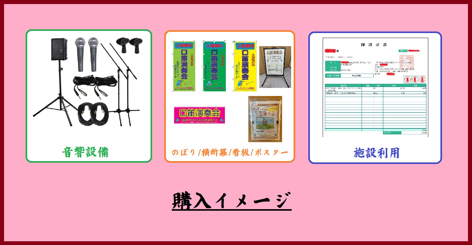 壊れた音響設備(スピーカー、マイク、各種ケーブル 等)の購入費と、施設利用料やのぼり・看板・ポスター制作費等 に当てさせていただきます。