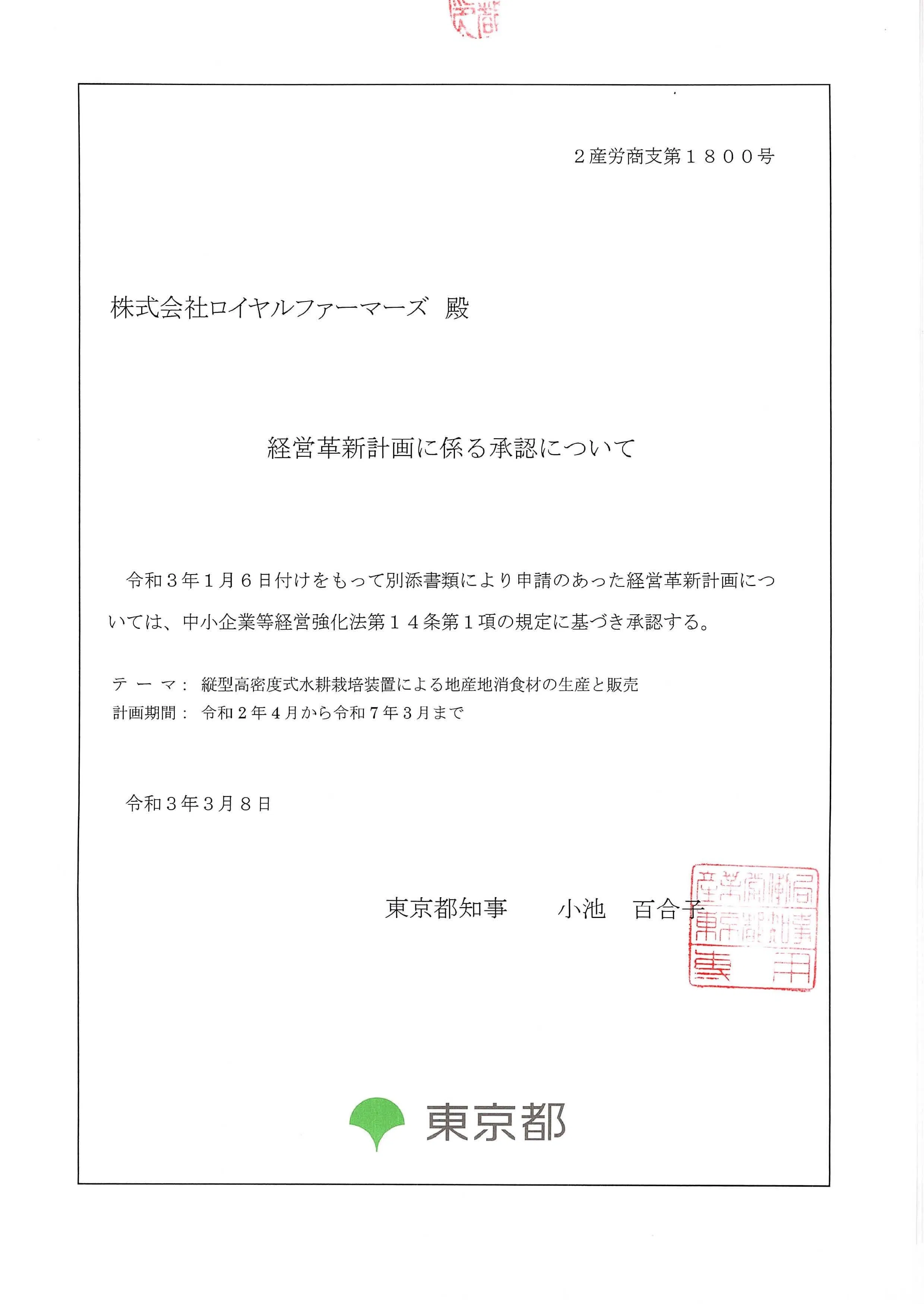 東京でこんなことをやっている零細企業があることを知ってもらい認めてもらいたい、そんな思いから知人の中小企業診断士の勧めもあり、研修制度の題材に取り上げていただき、8名もの中小企業診断士さんと「東京都中小企業経営革新計画」の申請に向けて、何度もディスカッションを繰り返し、昨年、2021年1月申請を済ませ、同年3月に承認を取得することが出来ました。