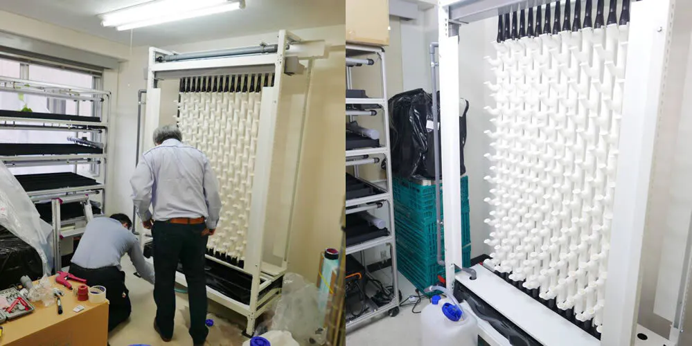 2019年の秋に開催された展示会で大手建築資材メーカーが製作したいわゆる野菜工場型の装置として高密度式垂直型の栽培装置に巡り合うことができましたが、一部の部品に魅力があるものの工場をイメージする重厚感は正直違う方向のものでありました。ただ、仕組みとしては私たちが求めていたものと同じスタイルでしたので、まずは1年間の試験機として栽培を行うには問題なしと判断して、培地やLEDを当社が望んでいたものにカスタマイズして装着することで購入を決定しました。