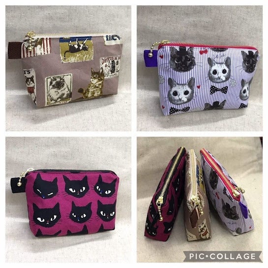 ハンドメイド猫柄ミニファスナーポーチ サイズ横15cm×高さ10cm マチ3cm