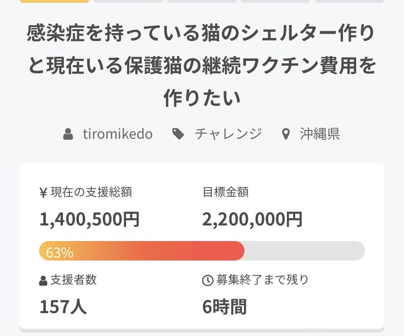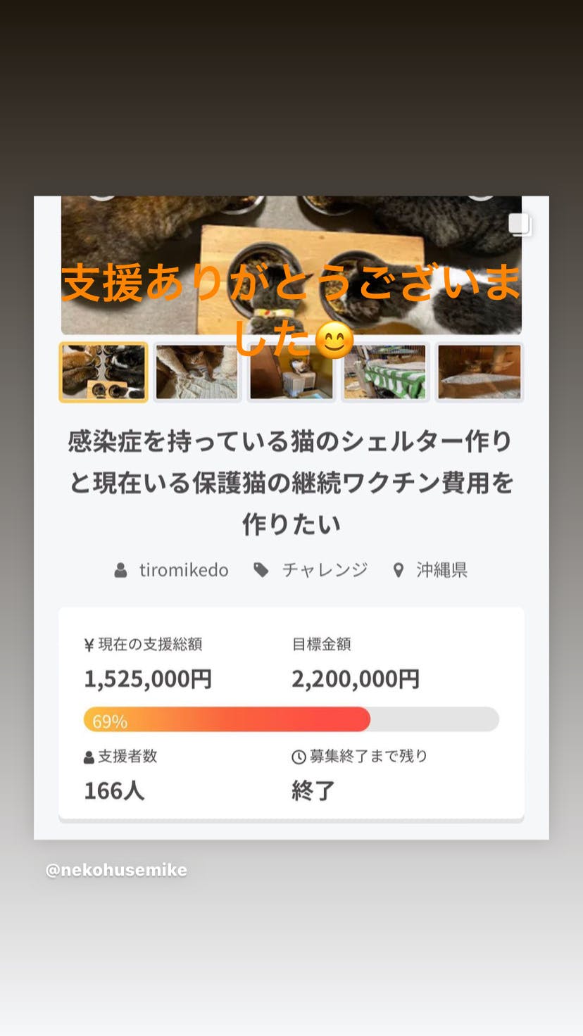 2022/04/16 07:07クラウドファンディング終了クラウドファンディング167名の方から支援いただいきました 目標金額2.200.000円支援総額1. 525.000円目標達成率69% でしたしかしサイトへ入力できない、手数料が取られるからと問い合わせがあり直接銀行へ振り込み、あるいは、手渡し、郵送などで22人の支援が有りましたその合計金額848.111円ありクラウド+支援金にて合計金額2.373.111円になり目標額2.200.000円を超え事実上達成しました、60日近い挑戦、一時はだめかもとおもいましたが自分の思いを発信、応援してくれた方の暖かい励ましでこれました、一回目のクラウドよりの支援者様、新しい方々、里親様、元同僚様、拡散を一緒に頑張ってくれた方々ありがとうございました、最後の挑戦でした、またやりませんか?っとオファーもあります今後は、継続して資金がつくれる方法も考えて行き末永くお付き合いねがいます、チビチビモンスター達、人の気持ち知らずでそだっています もっと見る至急ご連絡