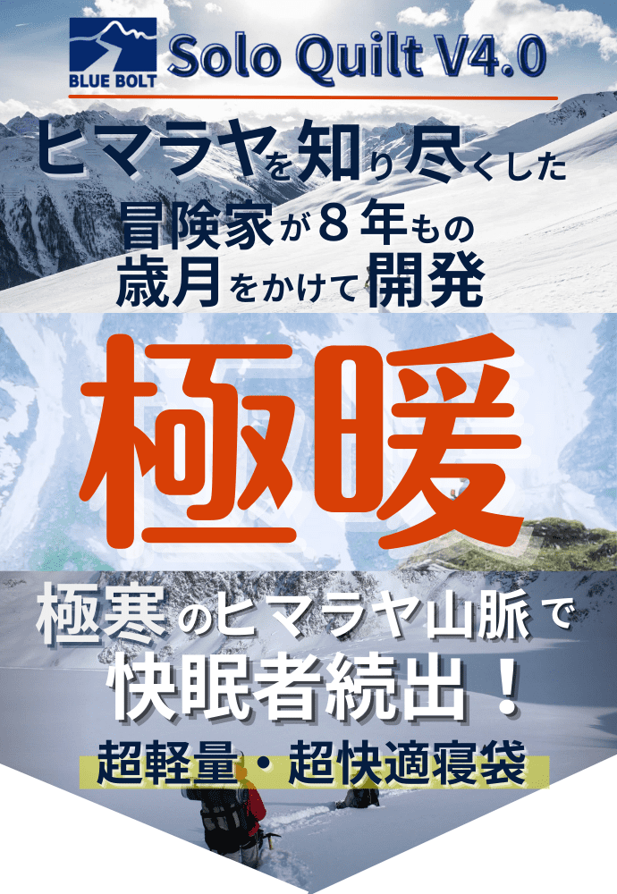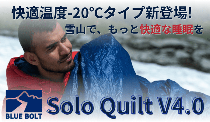 A:合成断熱材は、湿気の多いハイキング環境にも適しています。濡れても乾きやすい点が特長です。 ソロキルトに使用しているClimashield APEX合成断熱材は、軽量で熱効率の高い連続フィラメント構造です。それは中程度から氷点下の温度で継続的な温かさと快適さを提供し、さらには小さく収納することが可能です。