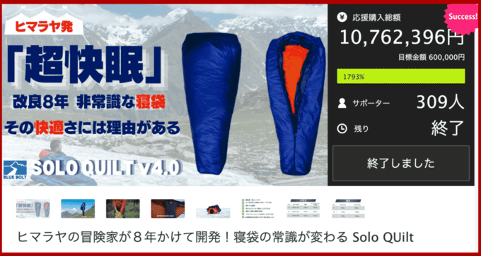 2022/10/27 19:50サポーターの皆様、お世話になります!冬の訪れを感じる今日この頃ですが、いかがお過ごしでしょうか。さて、-20℃タイプのソロキルト が、メーカーよりサポーター様宅へ発送されました。メーカーから直接のお届けになりますので、1〜2週間お待ちいただけますと幸いです。引き続きよろしくお願いいたします! ナイアトレード スタッフ一同 もっと見るプロジェクト終了のご報告とお礼