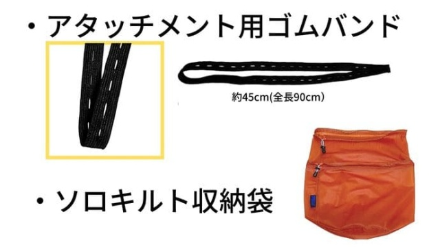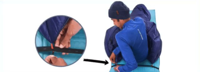 A:ソロキルトをマットに固定するためのものです。まず、アタッチメント用ゴムバンドを(寝袋の下に敷く)マットに装着。キルトをマットの上に置き、キルトの側面に取り付けられているトグル(留め具)をゴムバンドの穴に通して取り付ければ完成です。