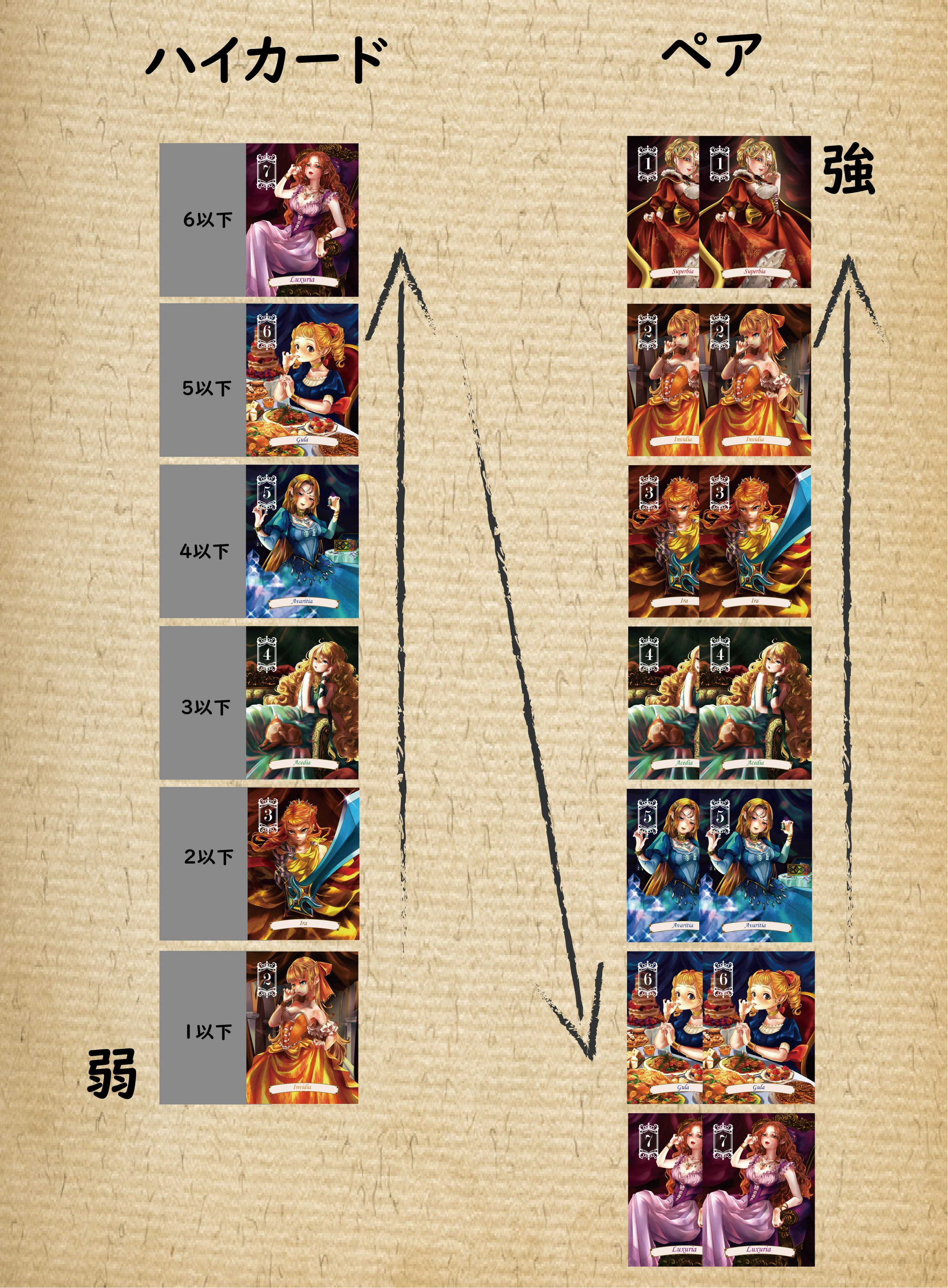 役はペアとハイカード(ペアでない2枚)の2つです。ハイカードよりもペアが強いですが、ハイカードと時とペアの時で数字の強さが反転している点に注意してください!