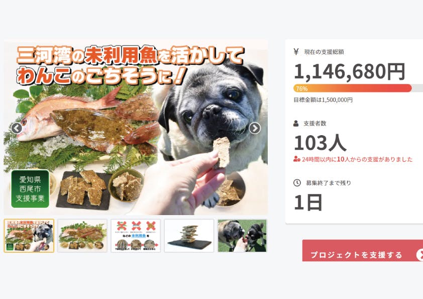 2022/04/29 00:00いよいよ、本日の23:59が締め切りです。クラウドファンディング終了前の最後のメッセージでは改めて今の想いをお伝えさせていただきます。おかげさまで、このメッセージ執筆時点でご支援額1,146,680円、ご支援者数103名様のご支援・応援をたまわり心からお礼を申し上げます。達成率も76%を超え、目標額である1,500,000円への可能性がみえてきたのも皆さまおひとりおひとりのご支援の積み重ねであり、感謝しかございません。今回のクラウドファンディングを通じて地元・愛知県西尾市でもぽわんこの宣伝活動を続ける中で、未利用魚に関係する水産業に携わる皆さま、そして、ワンちゃんを家族として大切に育てている皆さまに活動を知っていただき、直接応援していただけることもできました。今回の初めてのクラウドファンディング挑戦は、学びだらけの中で人のあたたかさを感じることもできました。普段、パソコンやスマートフォンを利用されない同じ水産業に関わる先輩の方々にも、クラウドファンディングとはというお話をさせていただいて、実際の支援までの説明を丁寧にすることでご支援いただけたこともありました。皆さまの想いをのせた今回の挑戦。なんとしても達成したいと考えています。残り本当にわずかな時間ではありますが、最後まで諦めず挑戦を続けます。三河湾の未利用魚を有効に使い、ワンちゃんのためのお魚100%の安心安全の食事を。そんな目標を達成するためには、どうしても皆さまのお力が必要です。リターンでは、三河湾で水揚げされたお魚で作ったひものや、お魚料理を提供する料理屋ぽわそんでのお食事券、そして、三河一色産のうなぎの蒲焼きが届くものまでご用意しています。残り、24時間。どうか、最後のご支援をいただけますと幸いです。最後までお読み頂きありがとうございました。クラウドファンディング終了までよろしくお願いいたします。 もっと見る