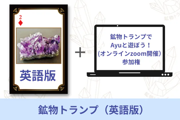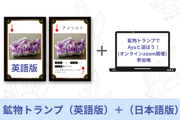 リターン②:新装版「鉱物トランプ」英語版1つと、「鉱物トランプでAyuと遊ぼう!」オンラインzoom開催参加権です。