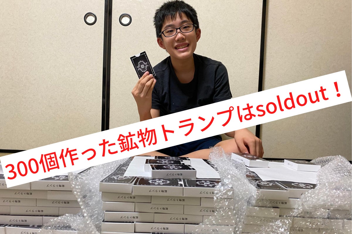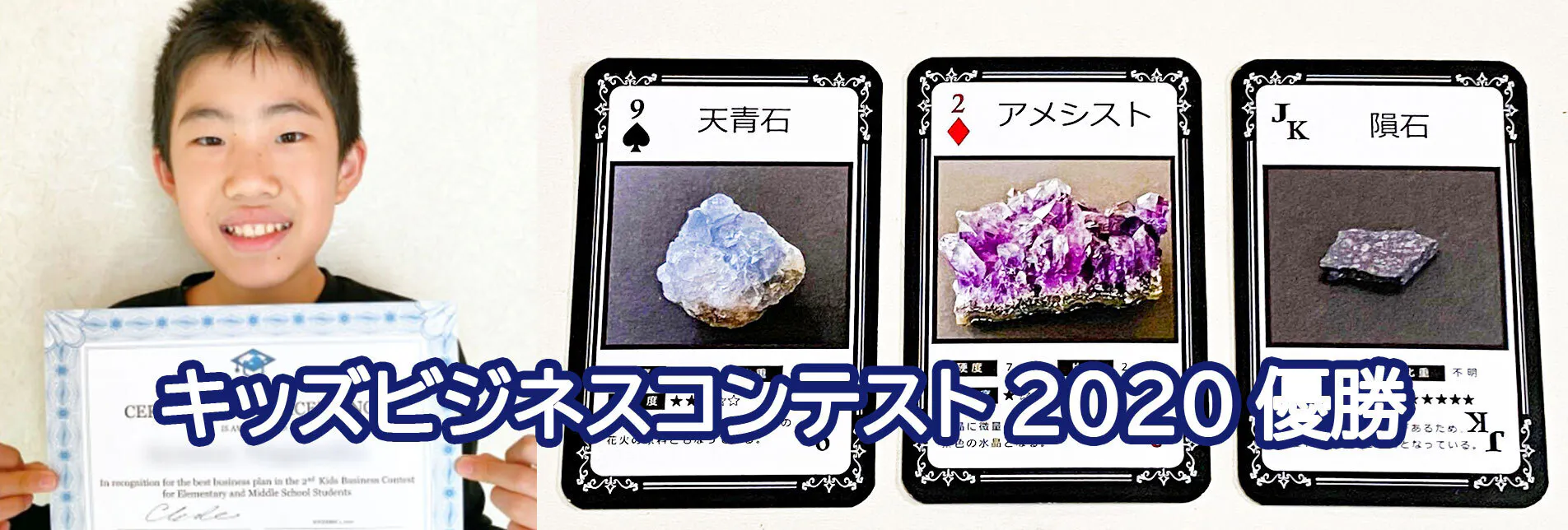 その後2020年11月、小学6年生の時に小・中学生対象のビジネスコンテストで、「石好き集まれ!3か国語でわかる石のトランプ~これであなたも石博士」という、それまでにありそうでなかった、僕が大好きな原石の鉱物が学べるトランプカードを作りたいと提案して、158票で優勝しました。